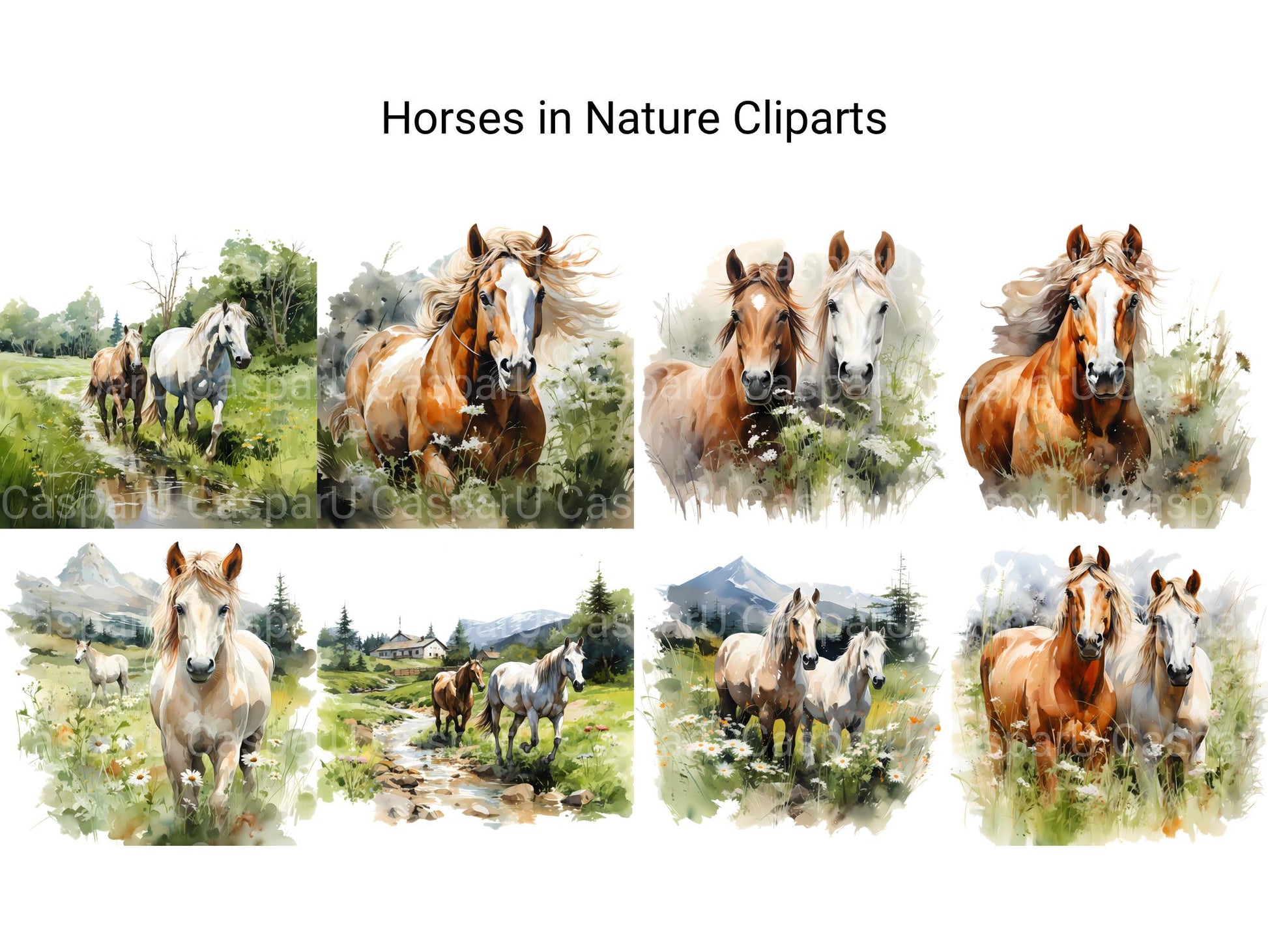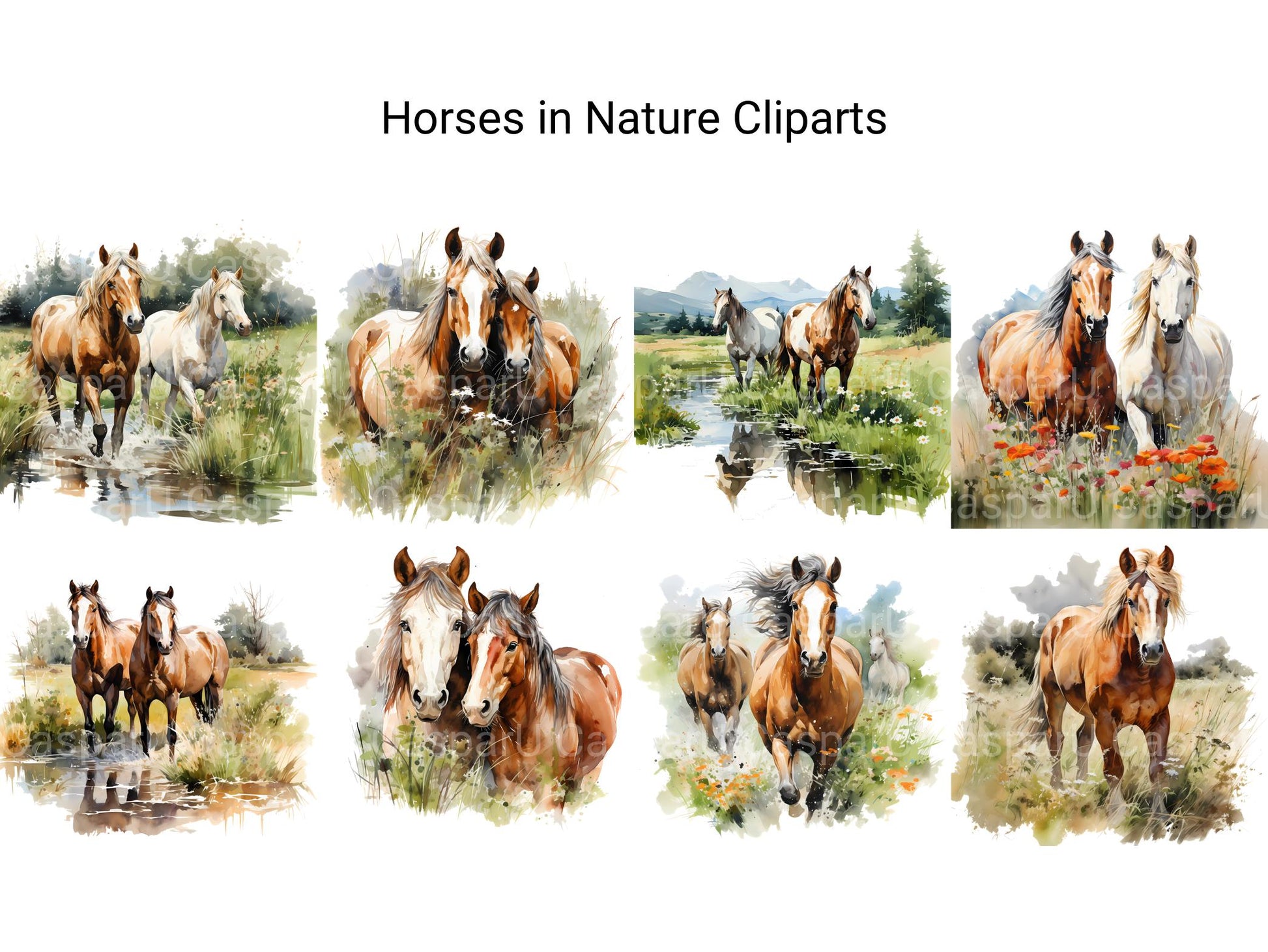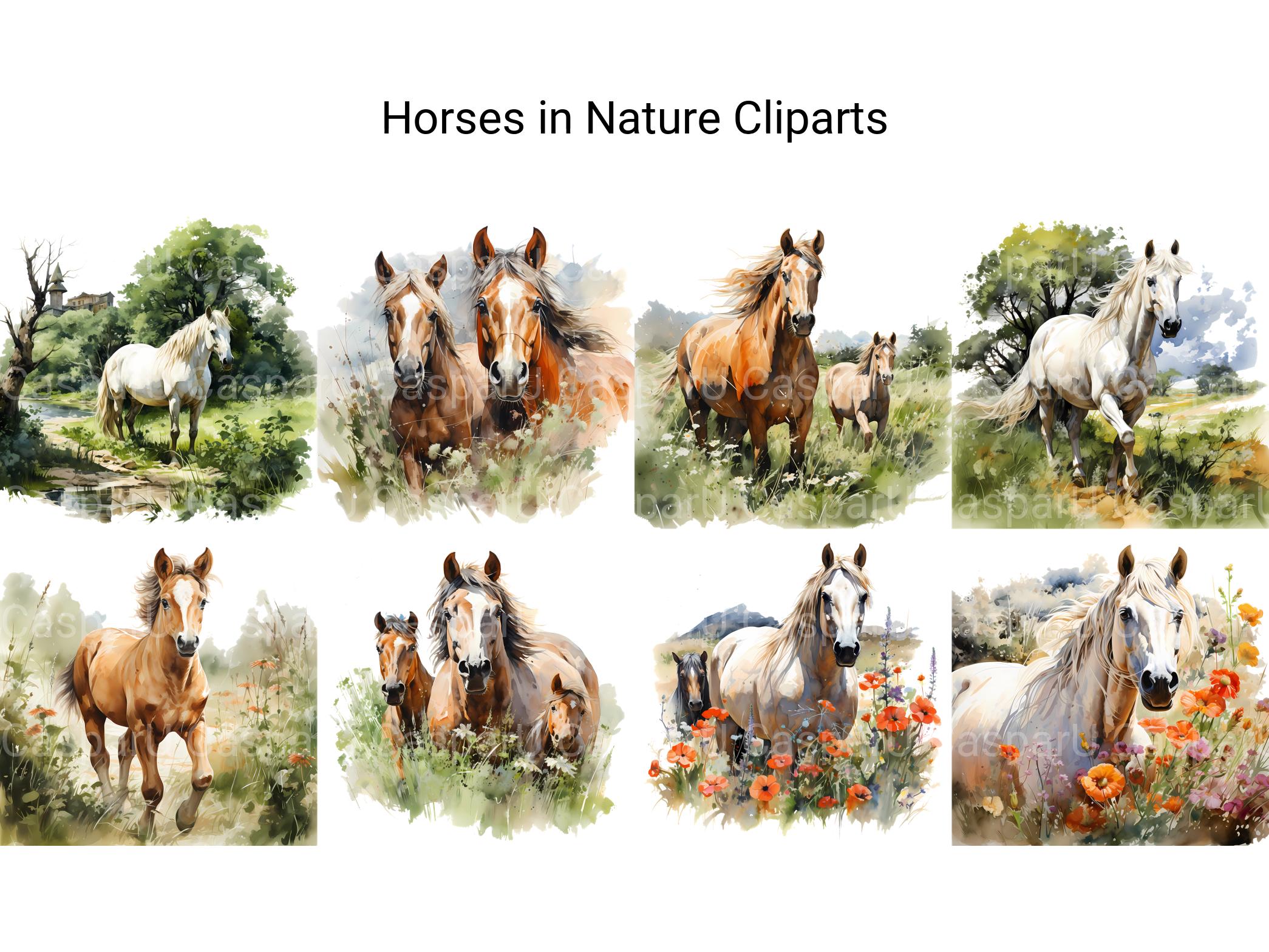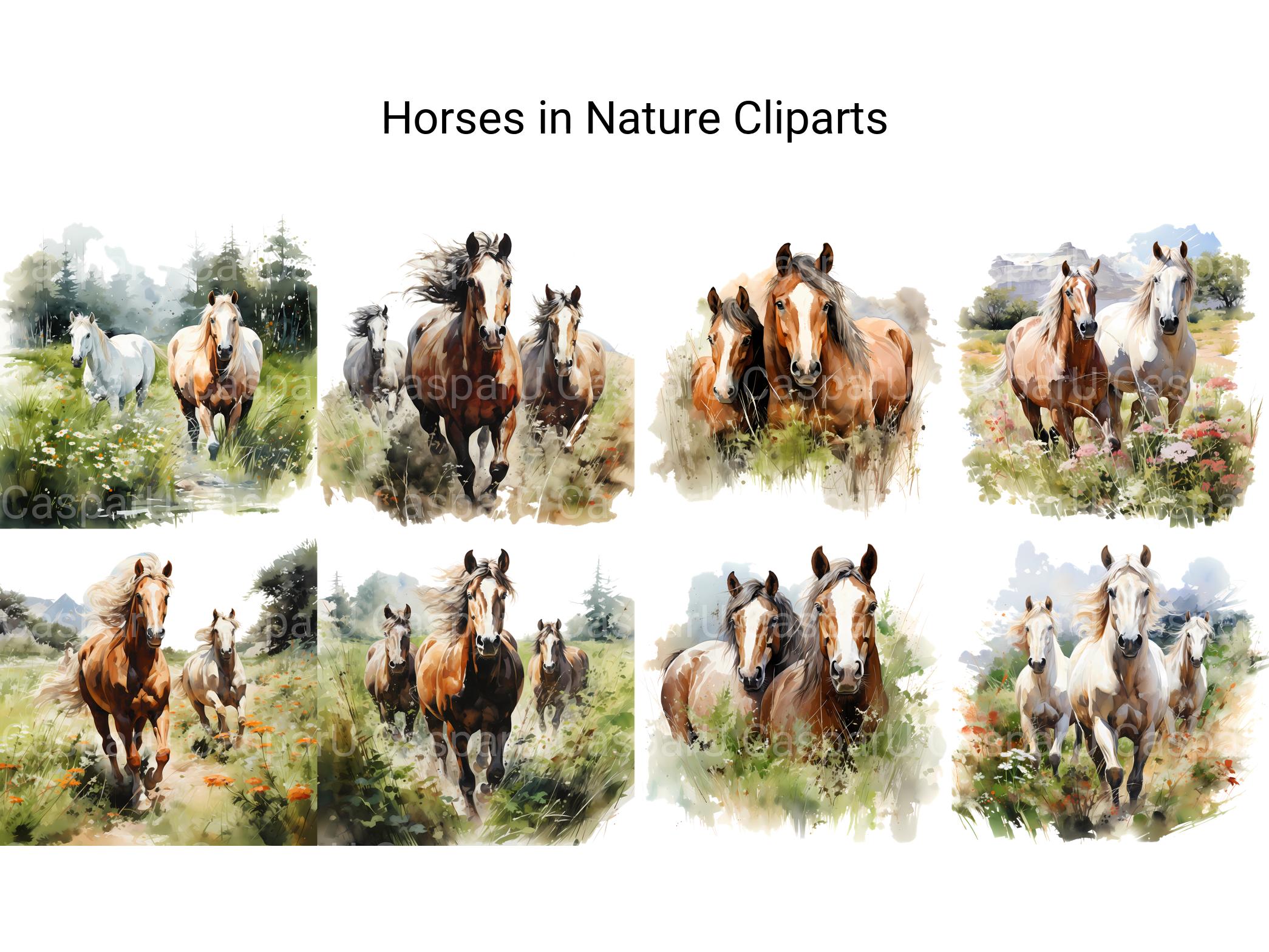 Immerse yourself in the beauty of the great outdoors with our Horses in Nature clip art. These serene digital illustrations showcase horses grazing in picturesque landscapes, surrounded by lush forests, rolling hills, and tranquil meadows, perfect for adding a touch of natural tranquility and equestrian elegance to your designs, whether for nature-themed artwork, outdoor decorations, or pastoral scenes, inviting viewers to experience the peaceful harmony of horses in their natural habitat.
