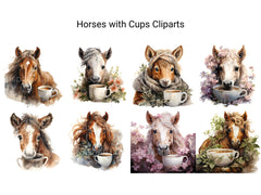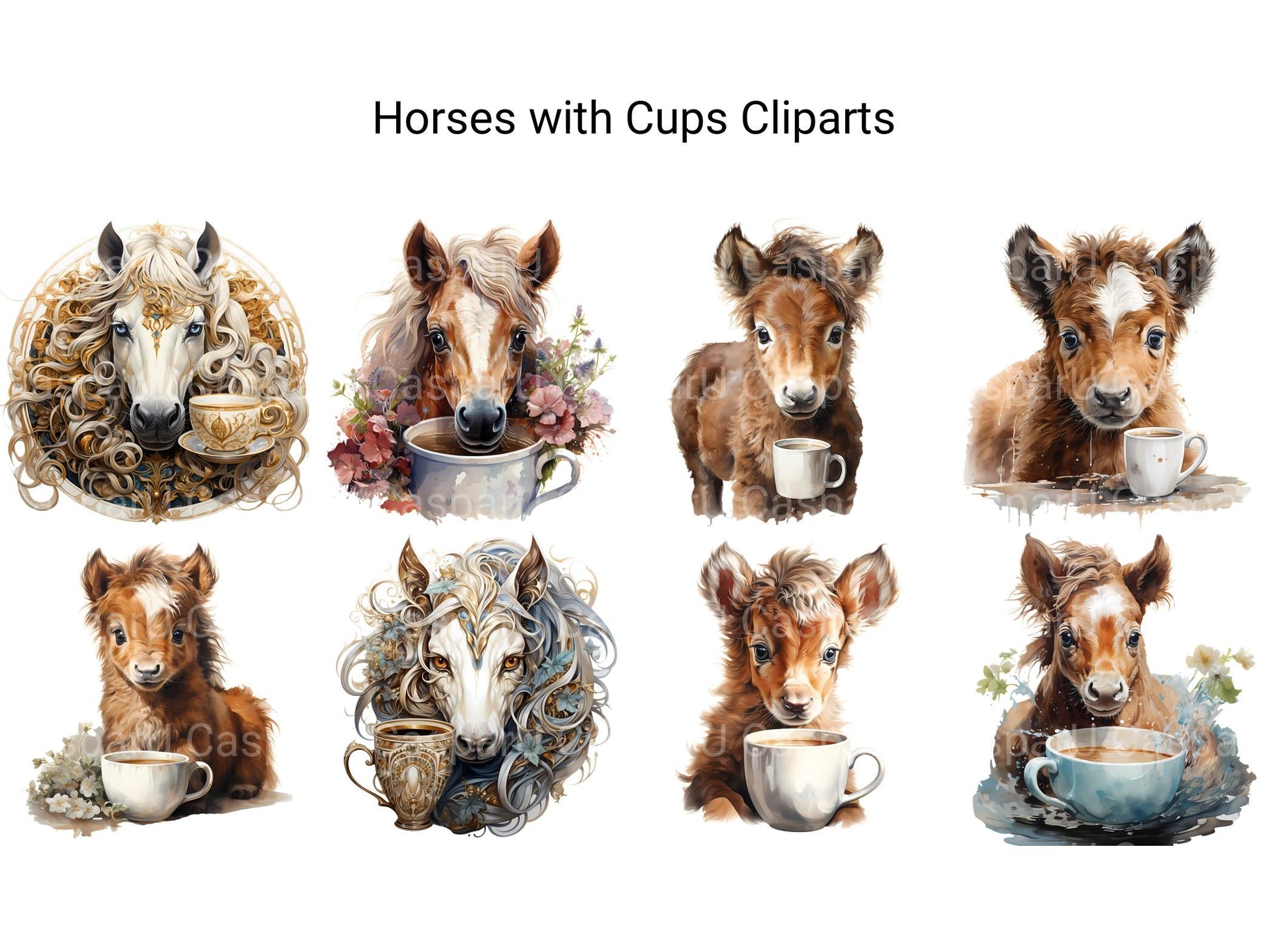 Saddle up for a delightful tea time with our Horses with Cups clip art. These whimsical digital illustrations feature horses enjoying a leisurely cup of tea or coffee, adorned with cute teacups and saucers, perfect for adding a touch of whimsy and charm to your designs, whether for afternoon tea invitations, café-themed artwork, or cozy decorations, inviting viewers to share in the joy of a relaxing moment with these endearing equine friends.