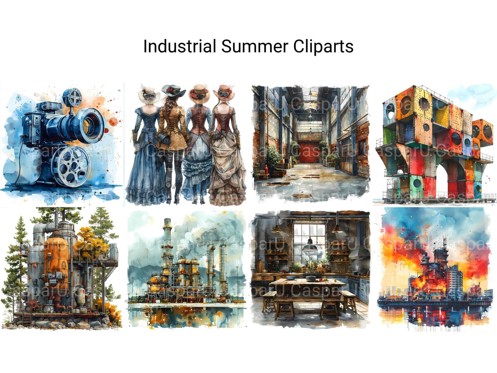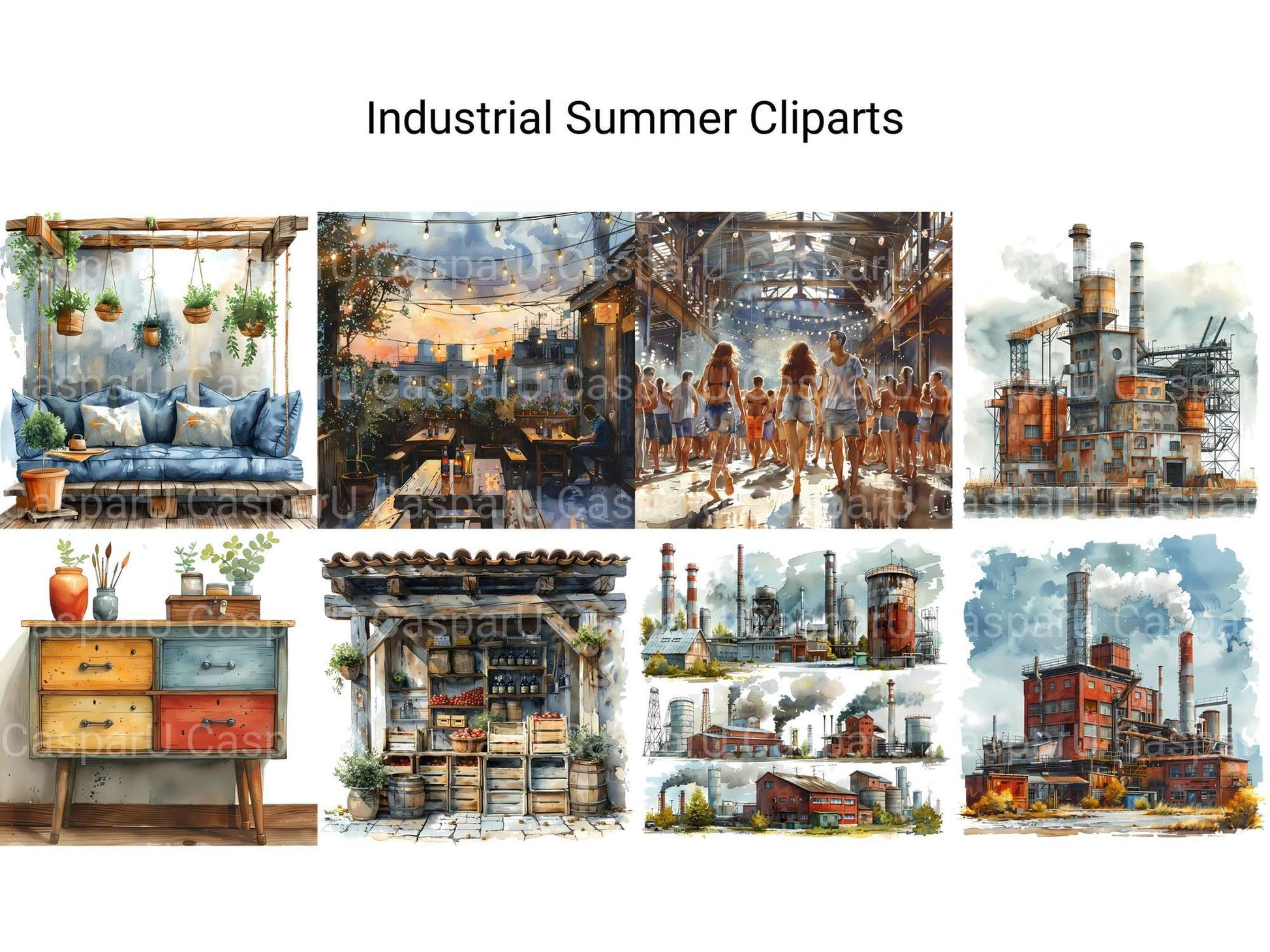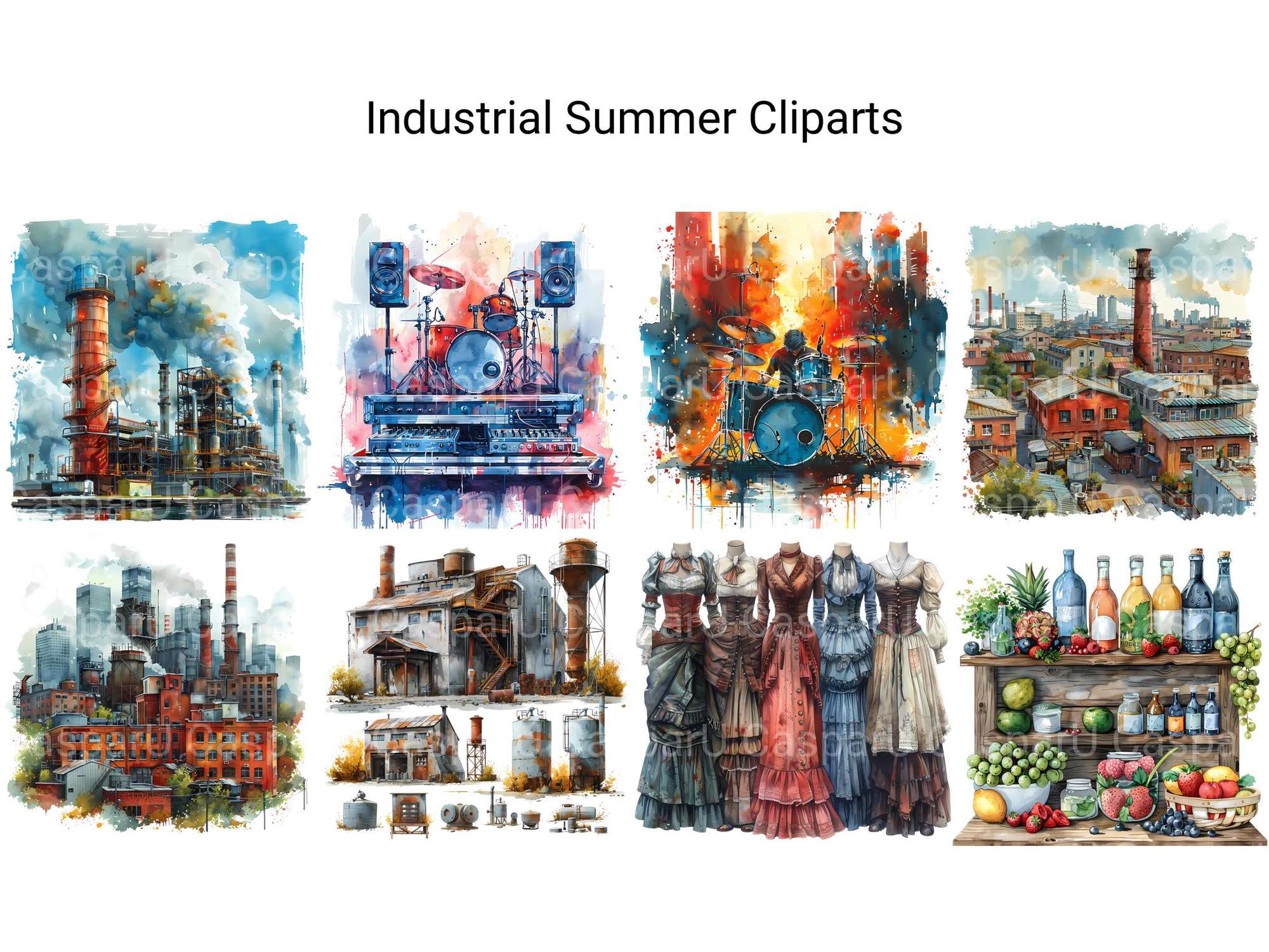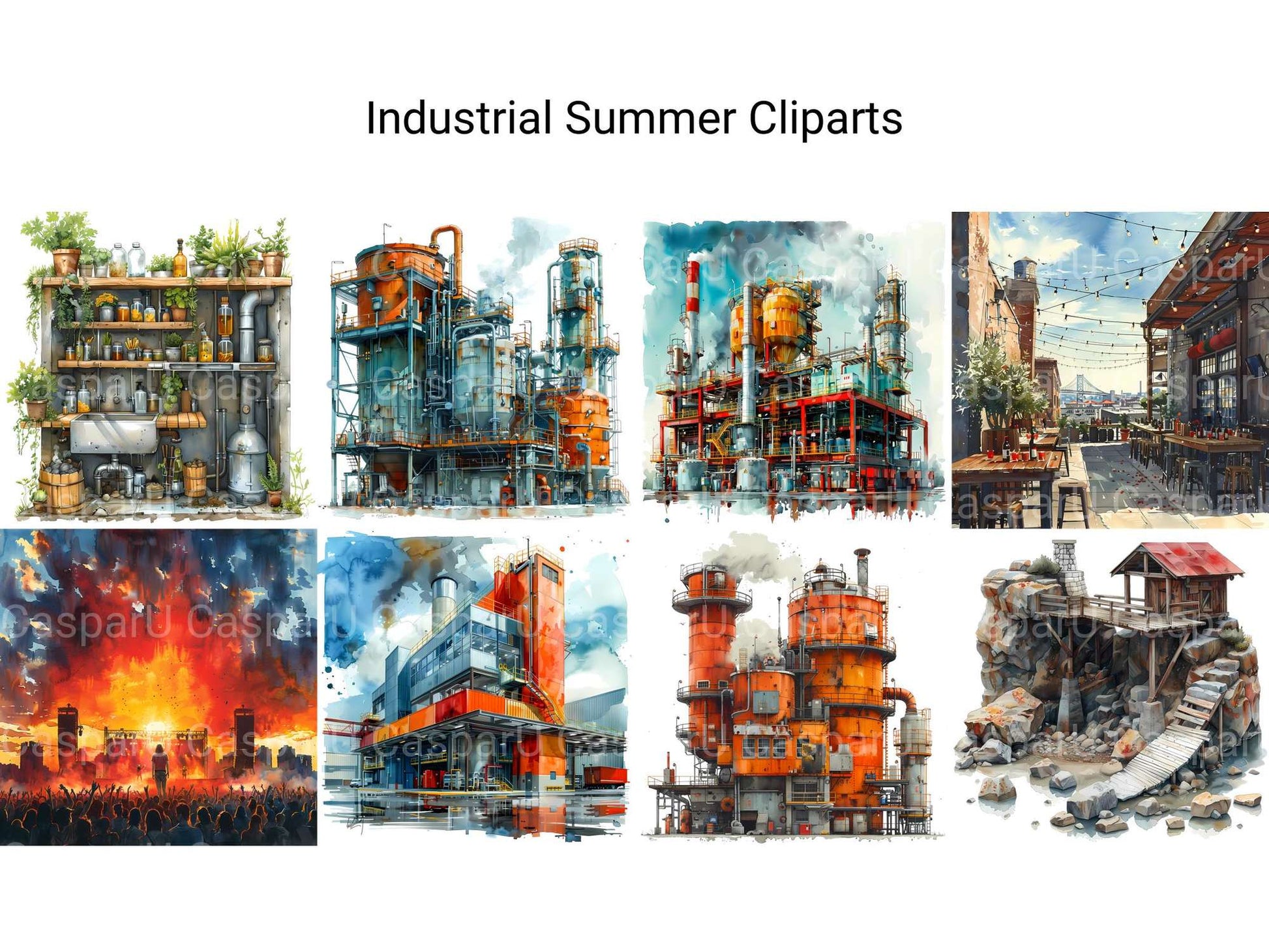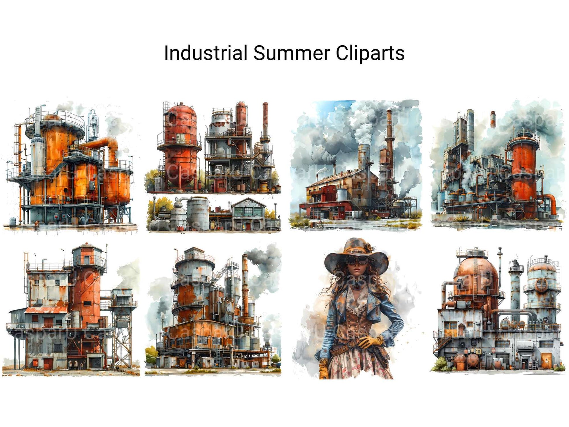 Explore the rugged beauty of Industrial Summer with our clipart collection, showcasing illustrations inspired by industrial elements and urban landscapes. These designs bring a modern and edgy feel to summer themes with their bold lines and textures.