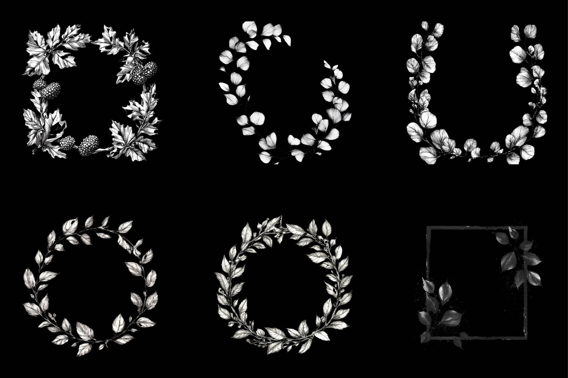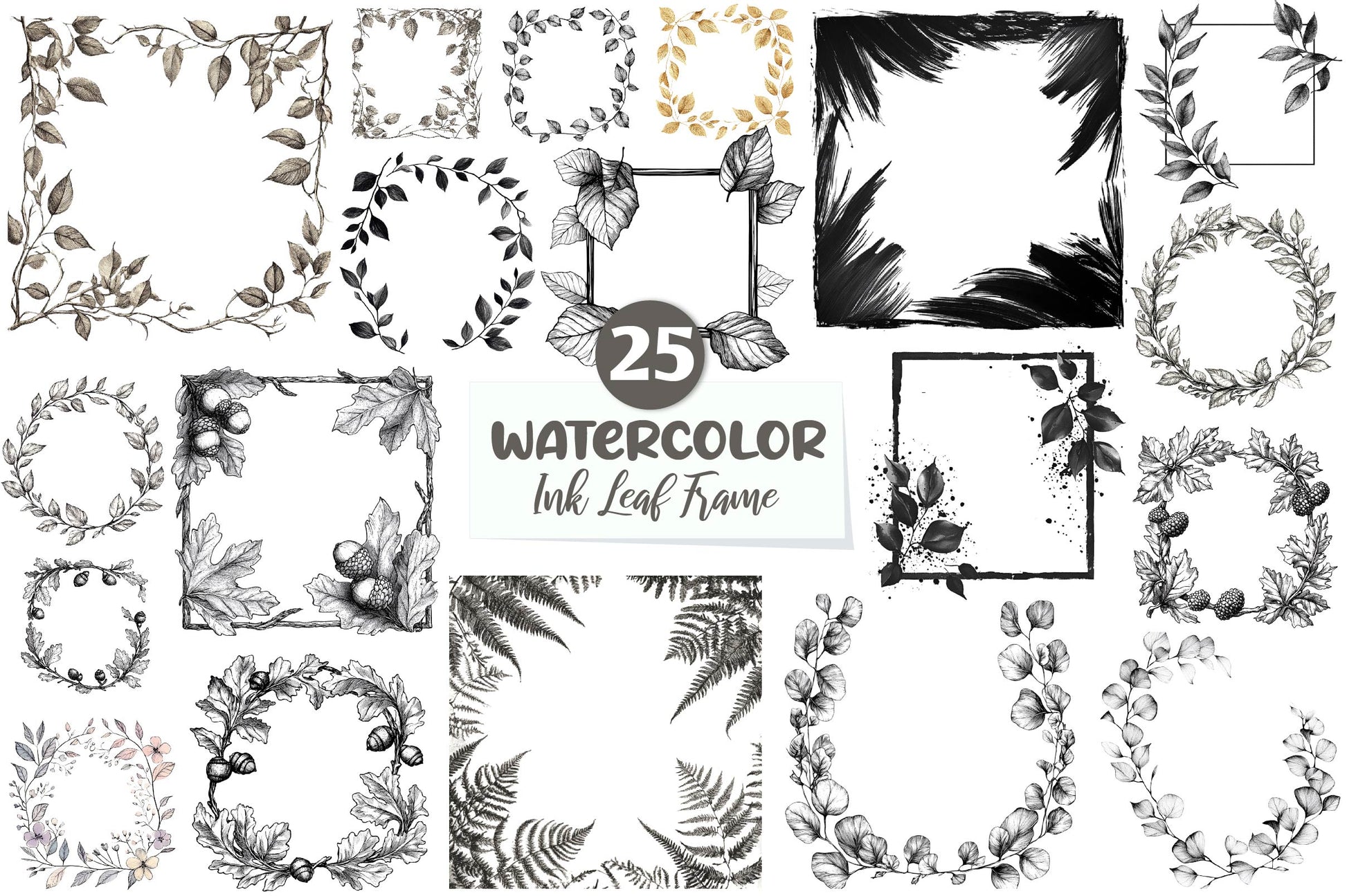 Frame with this Ink Leaf Frame Backgrounds Bundle, featuring artistic border designs, perfect for nature art crafts.