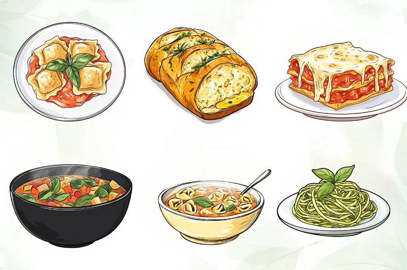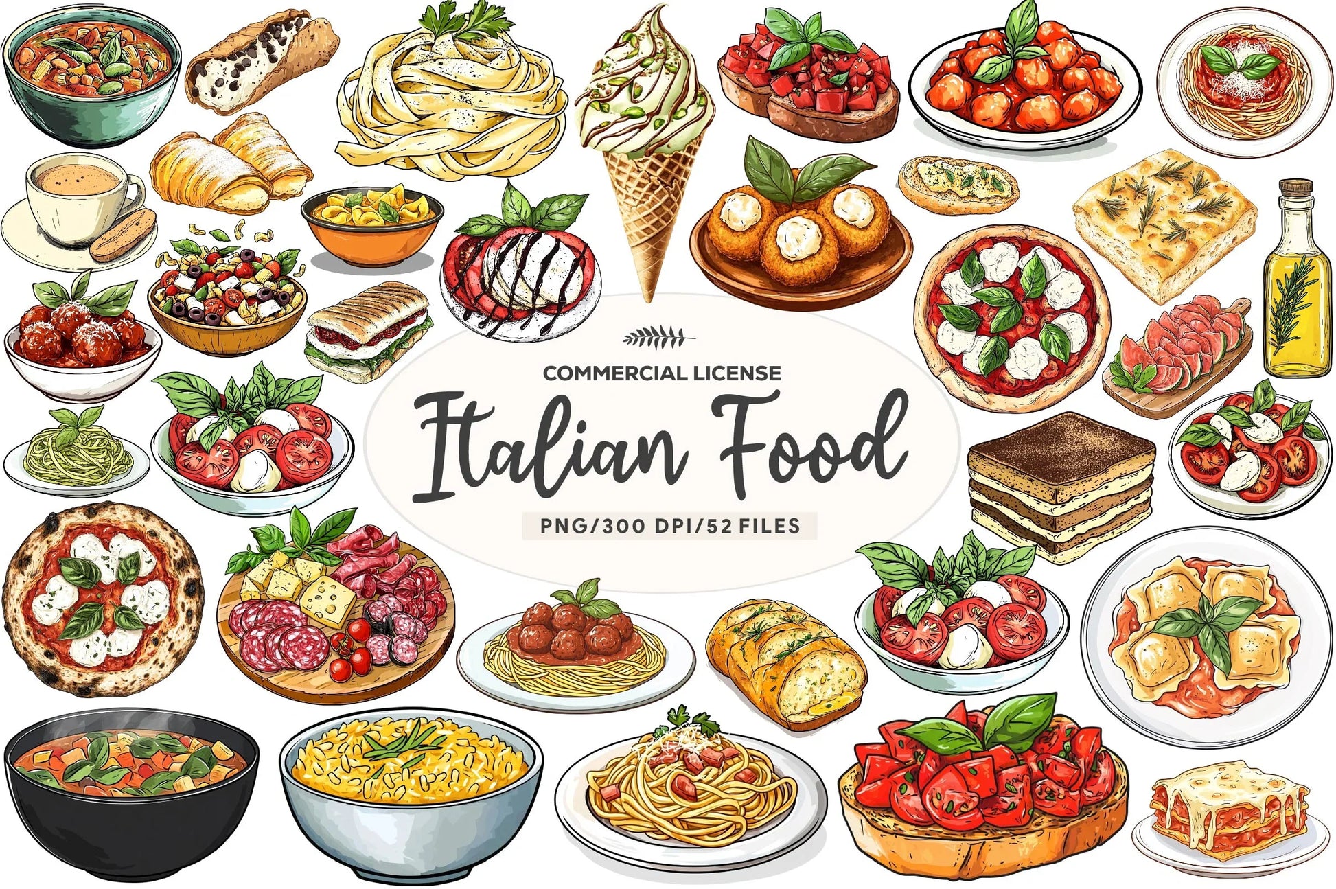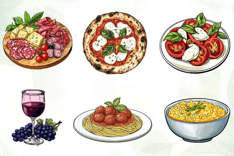 Enhance your culinary projects with our Italian Food Clipart Bundle, featuring vibrant and authentic Italian cuisine designs, perfect for menus, cooking blogs, and kitchen decor.