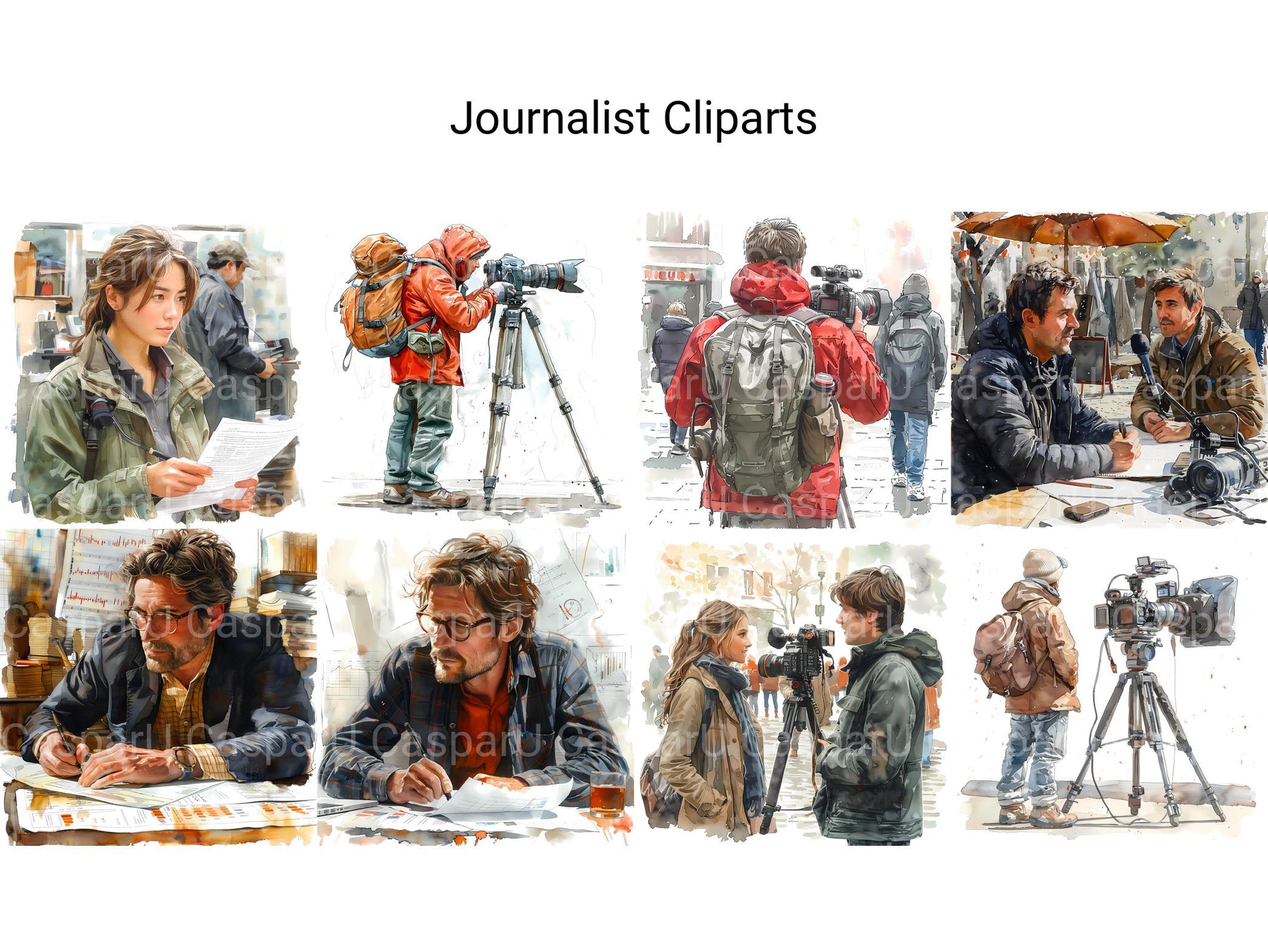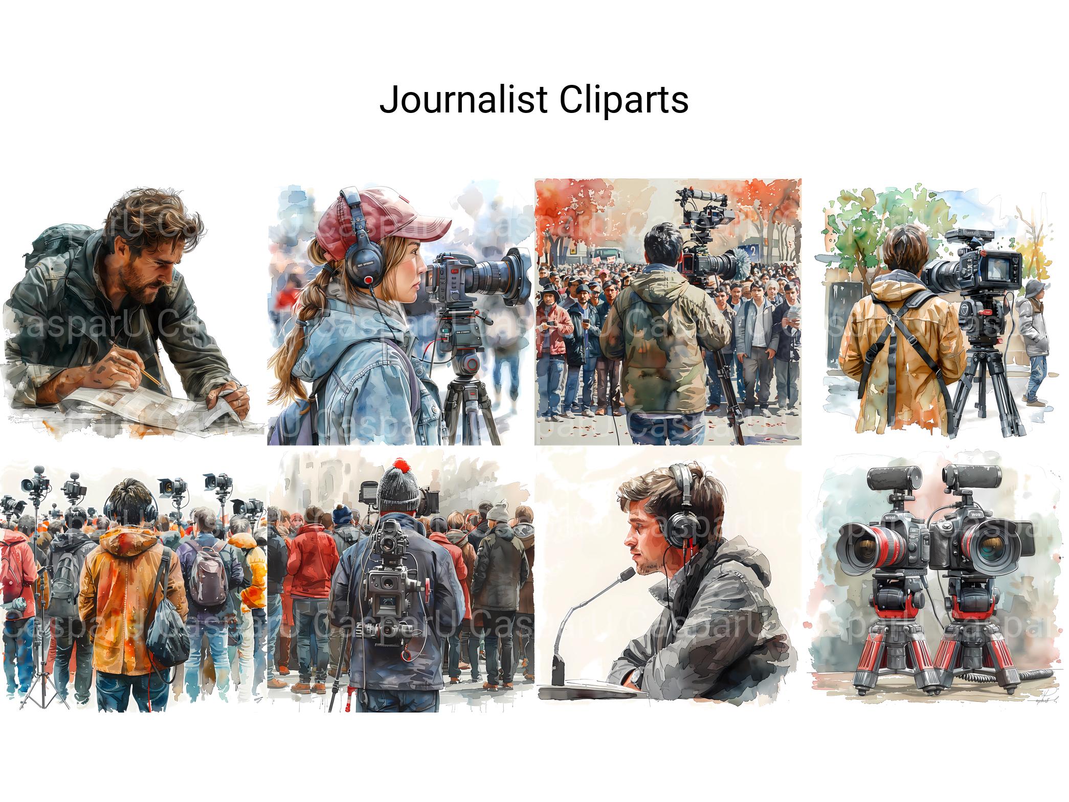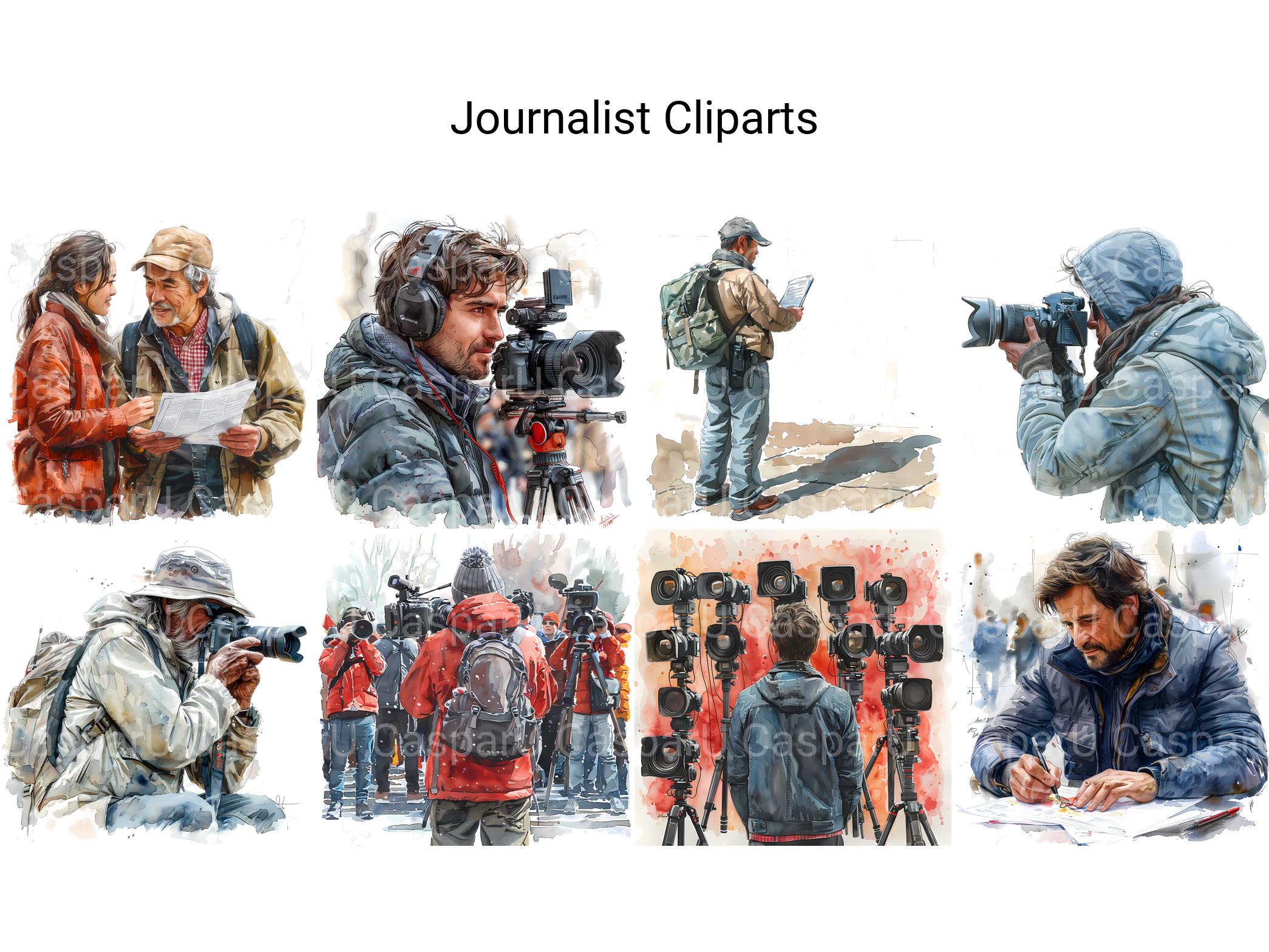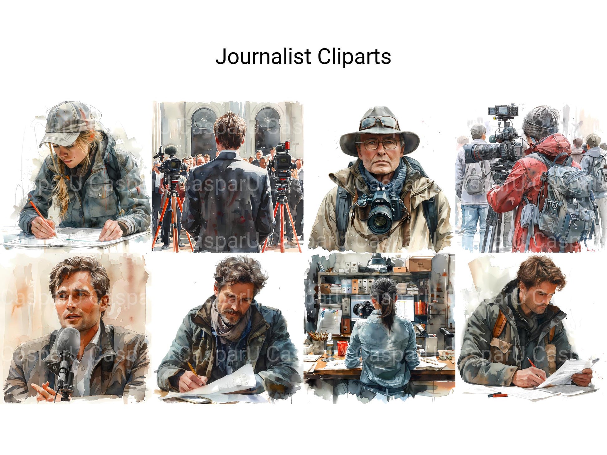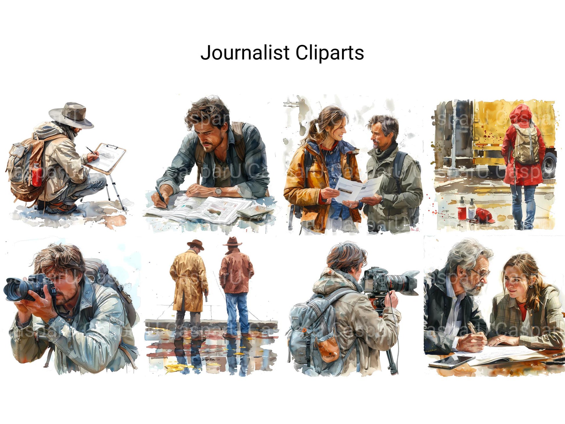 Our journalist-themed digital cliparts feature typewriters, notepads, and microphones. Perfect for enhancing news articles, blogs, and media presentations. These cliparts highlight the dynamic and investigative world of journalism.