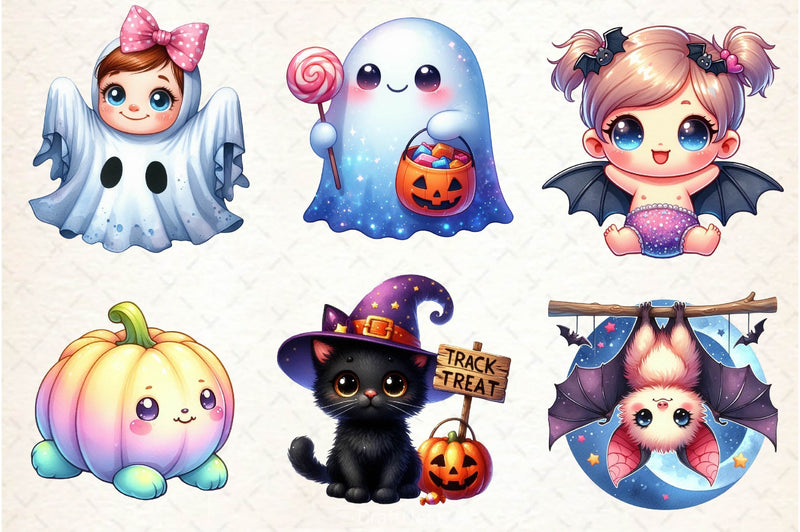 Cute with this Kawaii Baby Halloween Clipart Bundle, featuring adorable spooky designs, perfect for sweet Halloween crafts.