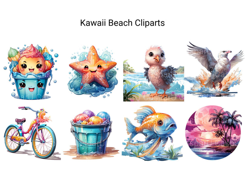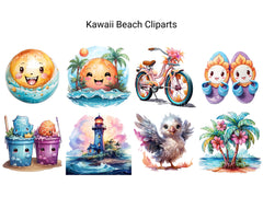 Immerse yourself in the sunny joy of Kawaii Beach clip art. These digital illustrations capture the cheerful essence of beach life with cute characters, vibrant beach scenes, and fun summer elements, perfect for adding a sense of relaxation and fun to your projects, whether for vacation-themed designs, scrapbooking, or beach party invitations.