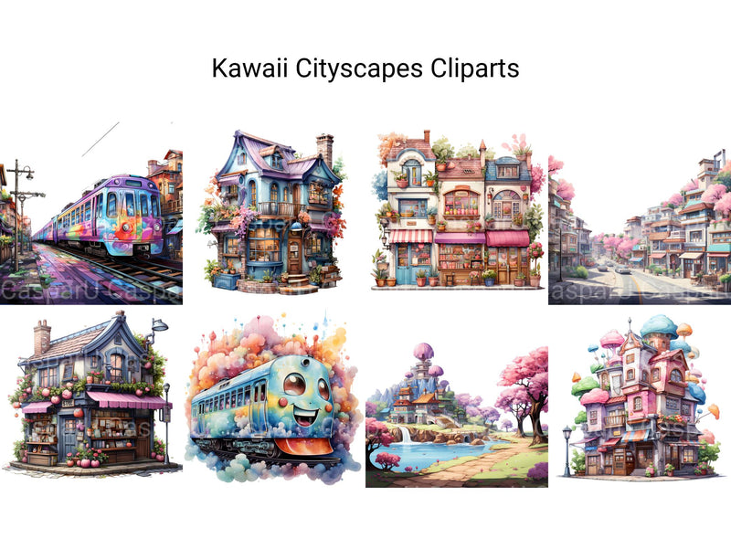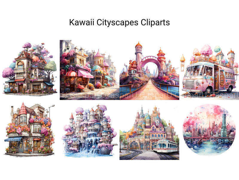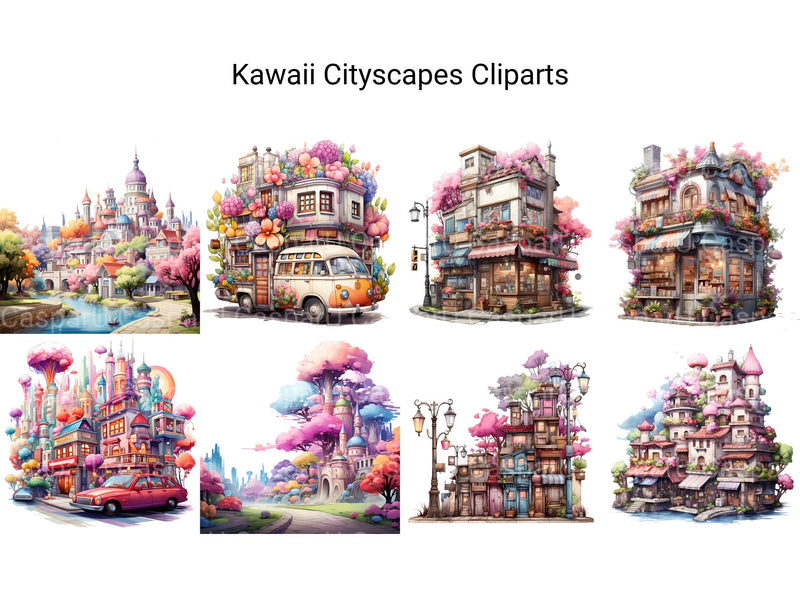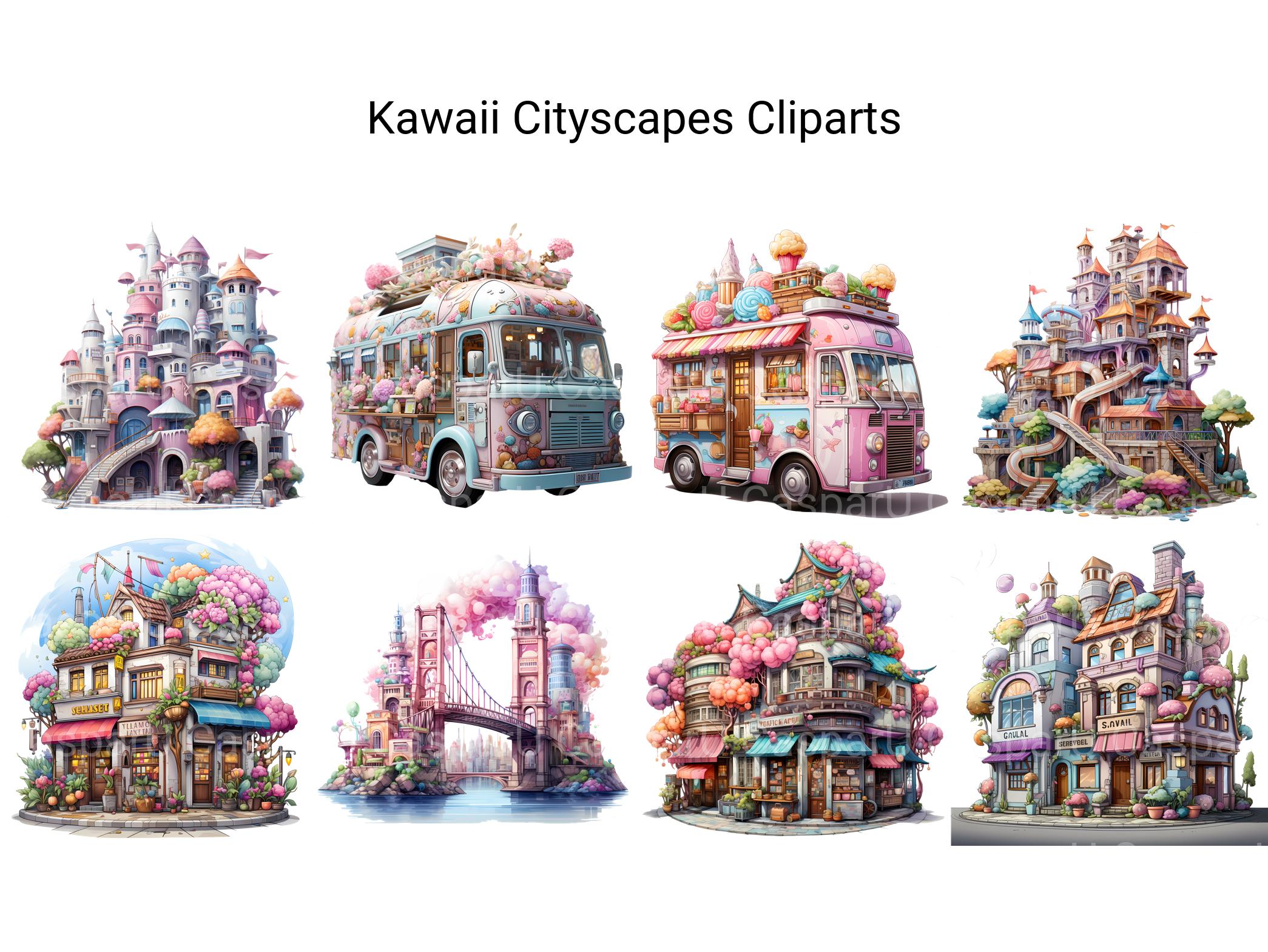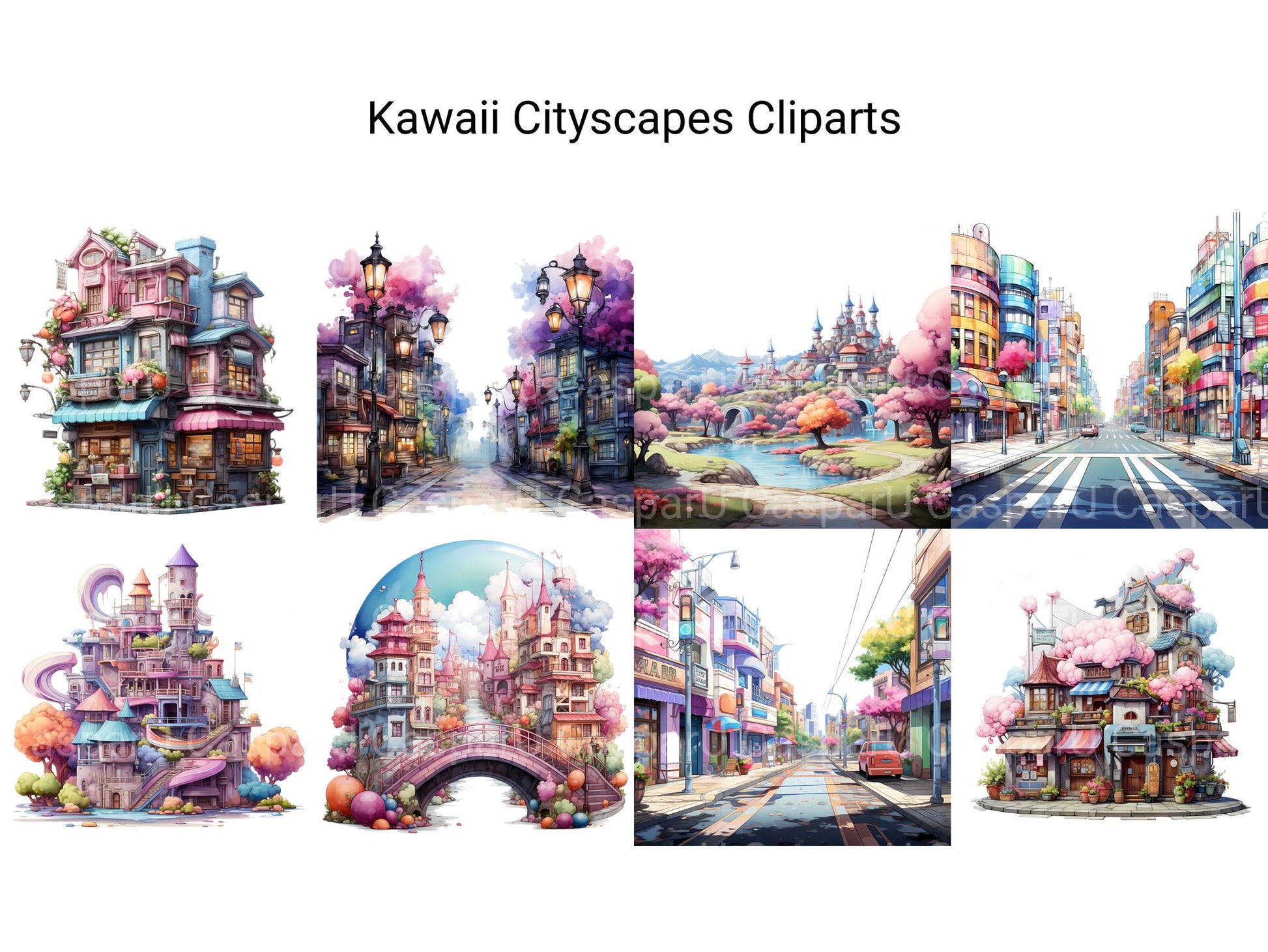 Experience the urban cuteness of Kawaii Cityscapes clip art. These digital illustrations showcase charming city scenes with adorable buildings, cheerful characters, and lively street scenes, perfect for adding a touch of whimsy and joy to your projects, whether for city-themed artwork, travel graphics, or playful designs, bringing smiles with their city charm.