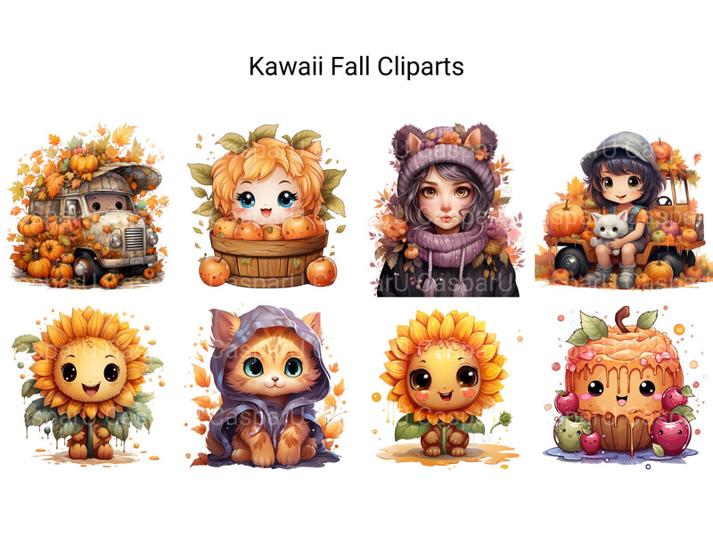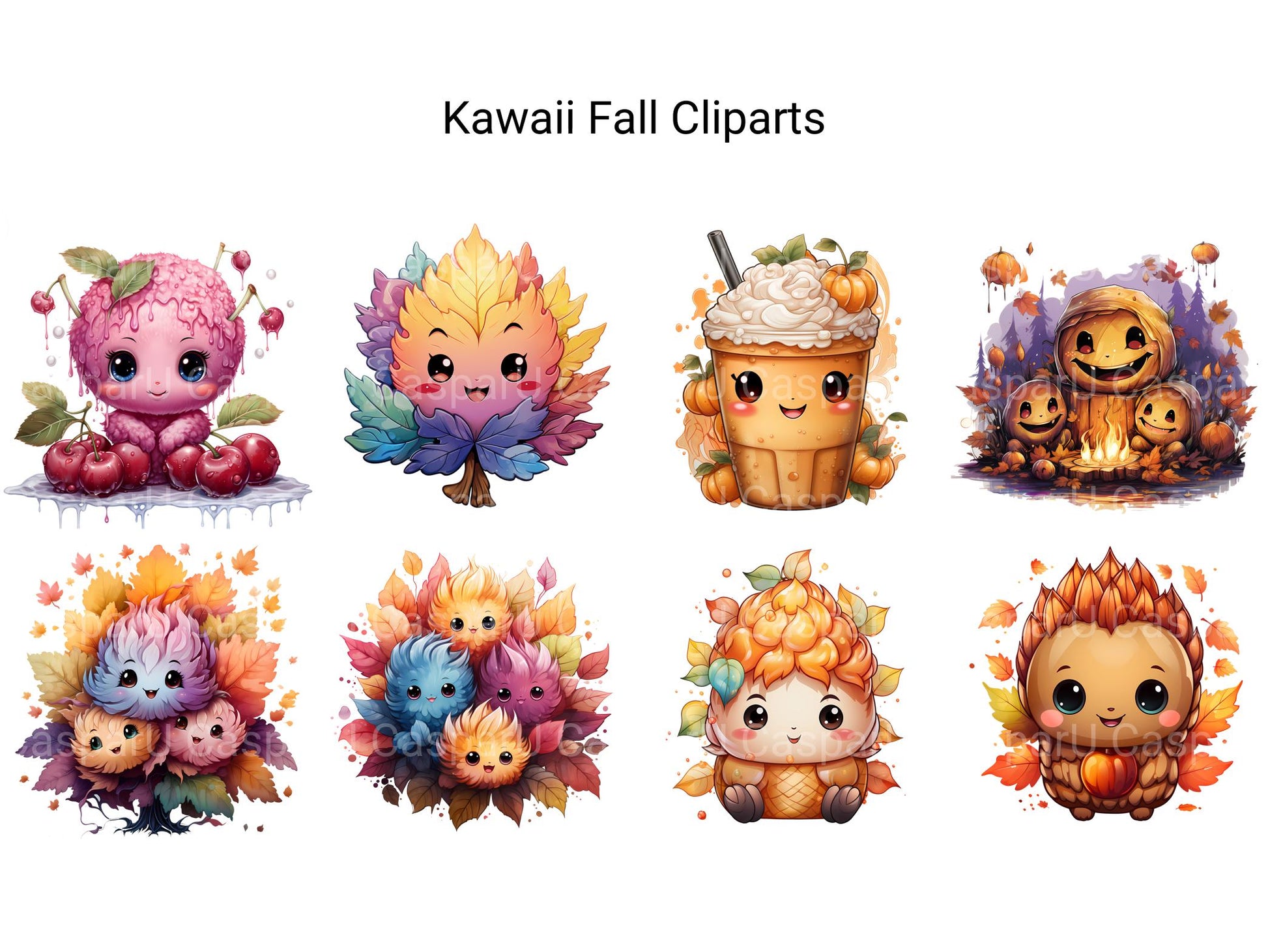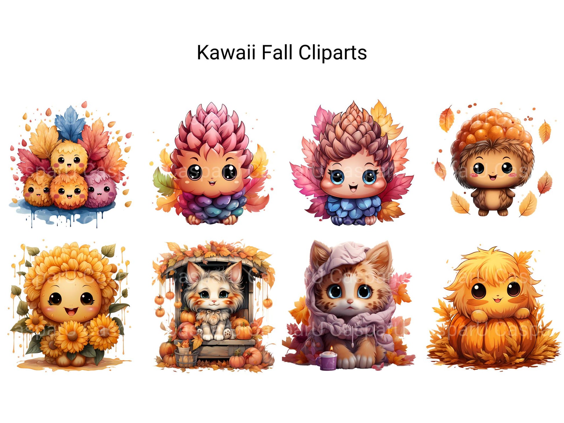 Revel in the cozy delights of Kawaii Fall clip art. These digital illustrations capture the whimsical beauty of autumn with cute characters playing in colorful leaves, pumpkin patches, and harvest scenes, perfect for adding a sense of seasonal charm and joy to your projects, whether for fall-themed decor, seasonal greetings, or playful designs, celebrating the magic of autumn with their fall flair.