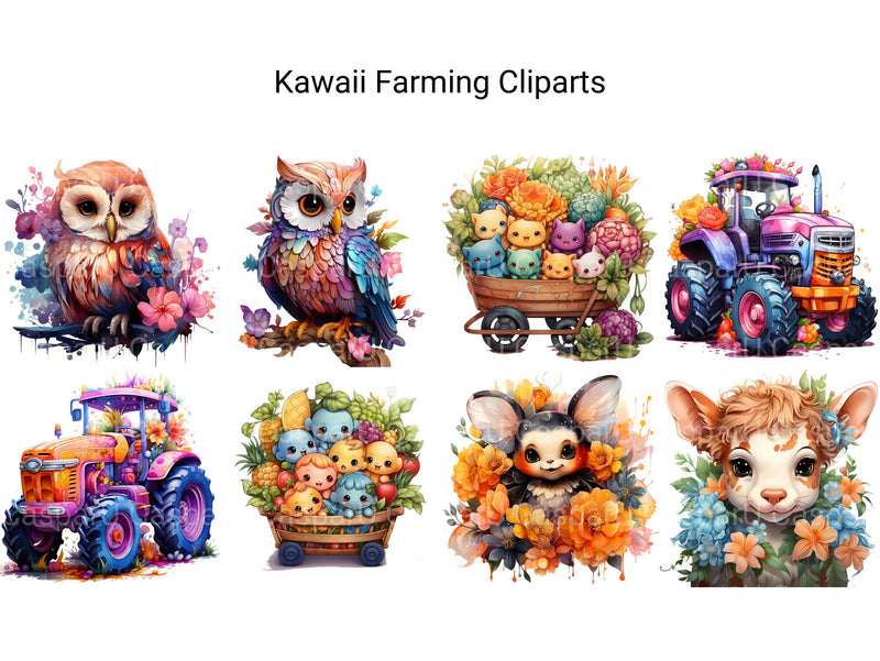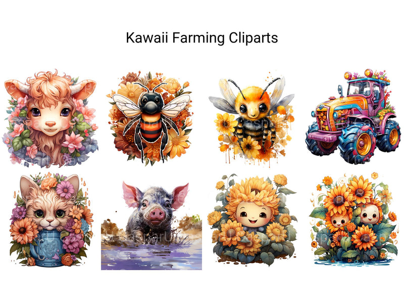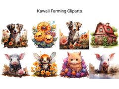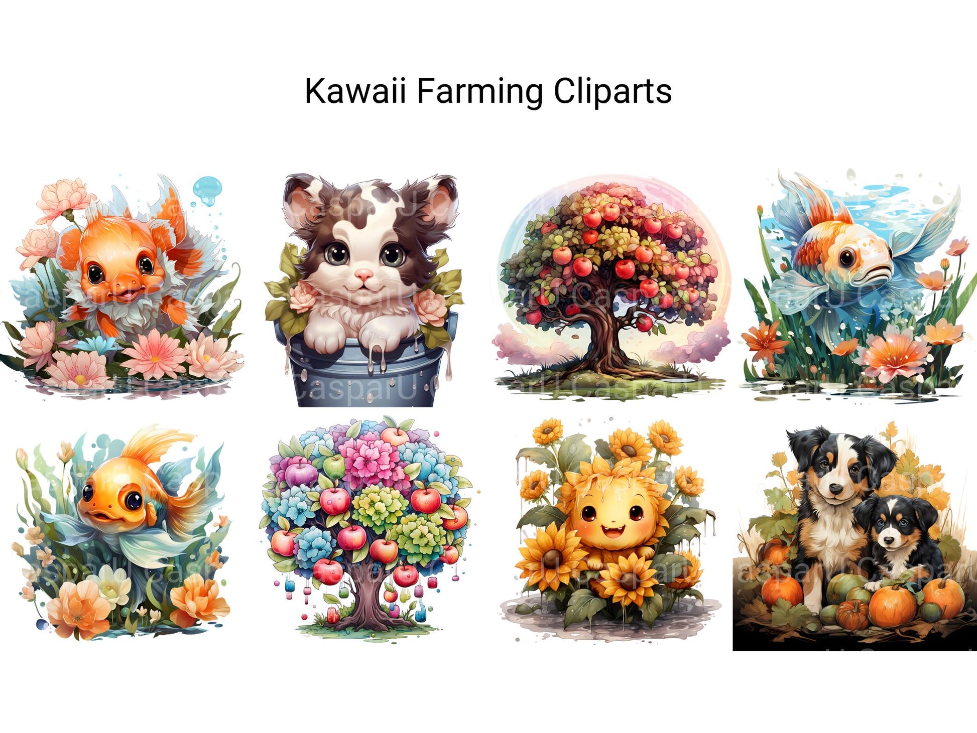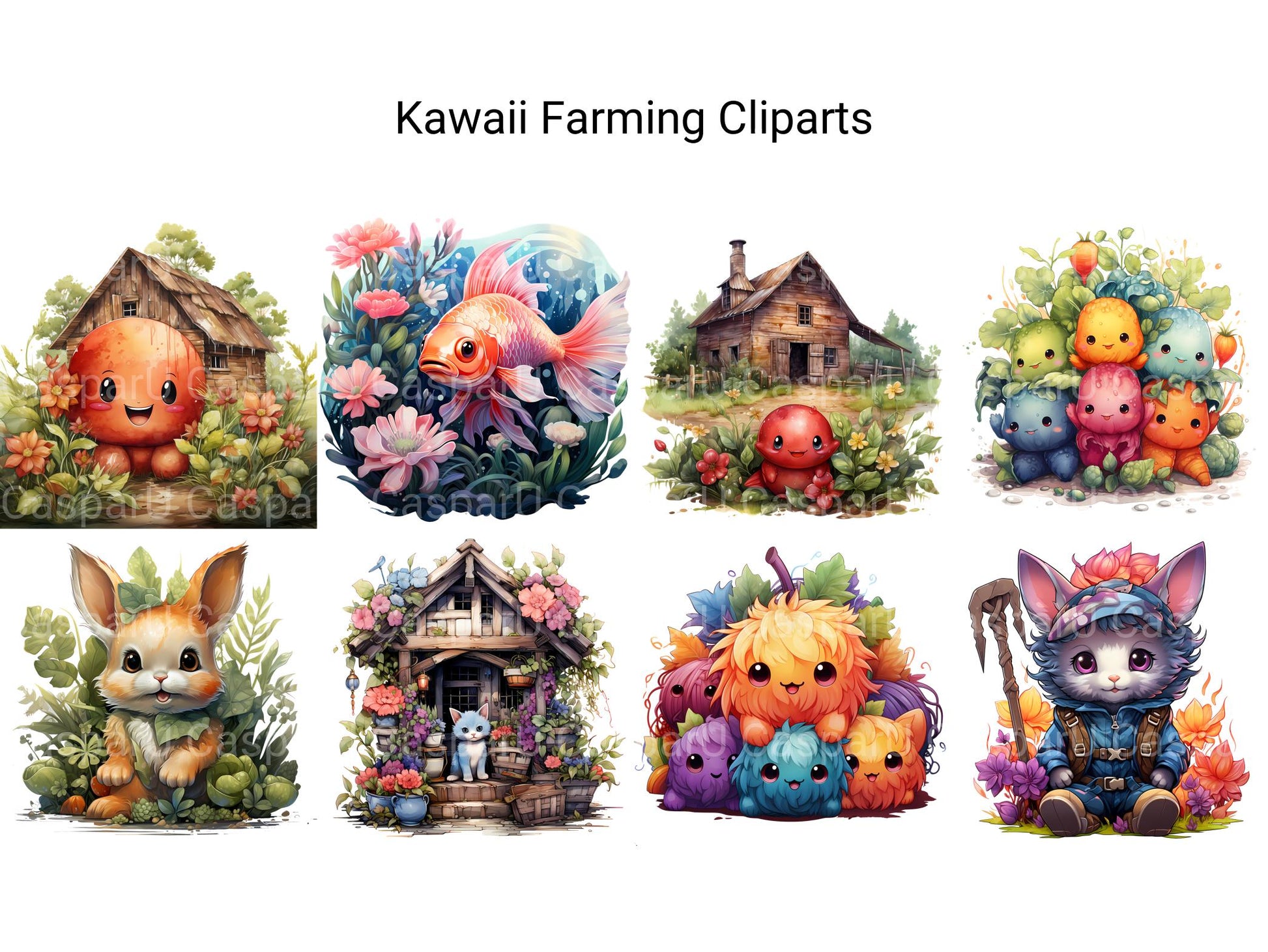 Experience the adorable side of agriculture with Kawaii Farming clip art. These digital illustrations feature cute farm animals, cheerful farmers, and charming farm scenes, perfect for adding a touch of rural charm and agricultural fun to your projects, whether for educational materials, farm-themed decor, or playful designs, bringing smiles with their farmyard cuteness.