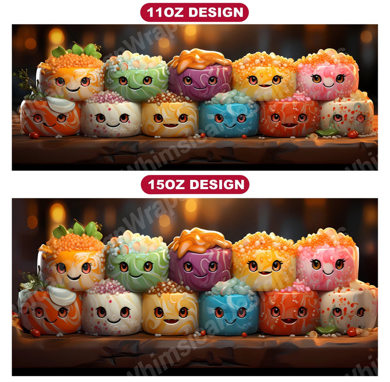 Experience the deliciousness of our Kawaii Food digital mug wraps. These adorable designs feature cute food characters and playful motifs, capturing the fun and excitement of culinary adventures, making them a delightful addition to your mug collection and a perfect way to start your day with a touch of gastronomic whimsy and kawaii charm.