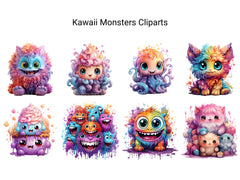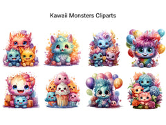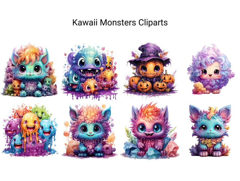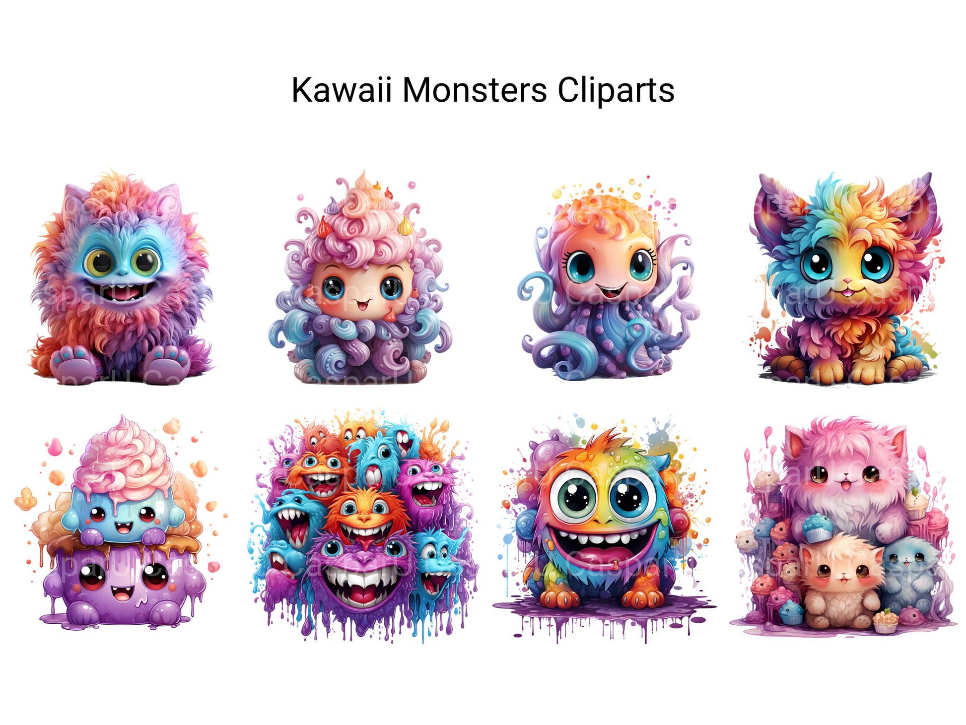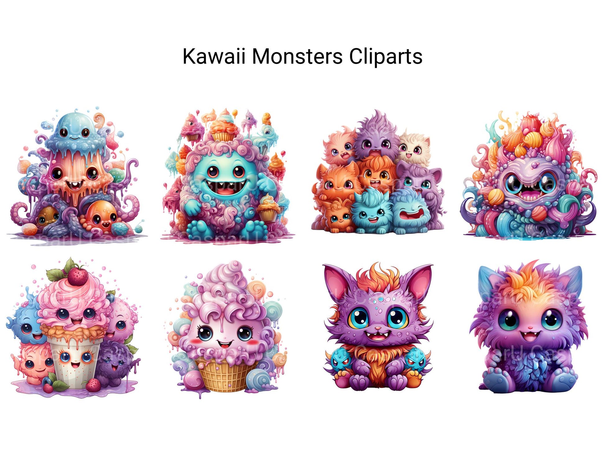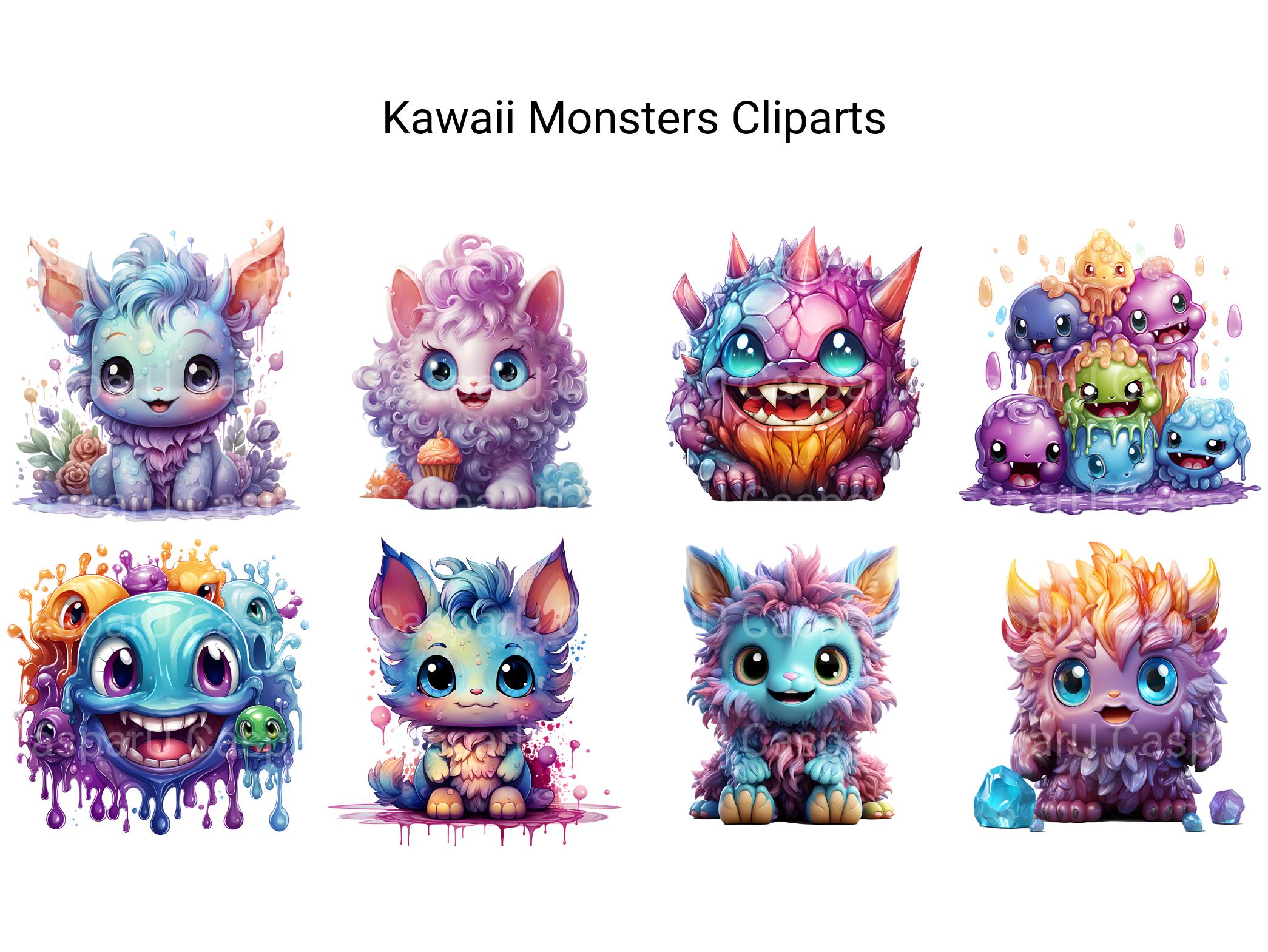 Meet the adorable inhabitants of Kawaii Monsters clip art. These digital illustrations showcase cute and colorful monsters with quirky personalities and friendly faces, perfect for adding a touch of playful spookiness to your projects, whether for Halloween decor, children's parties, or monster-themed designs, charming viewers with their monstrous cuteness.