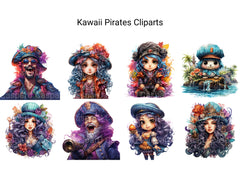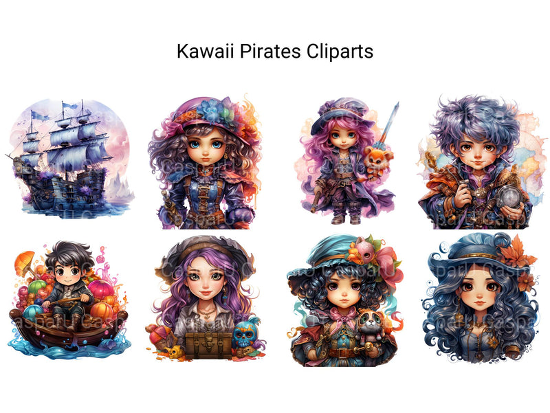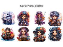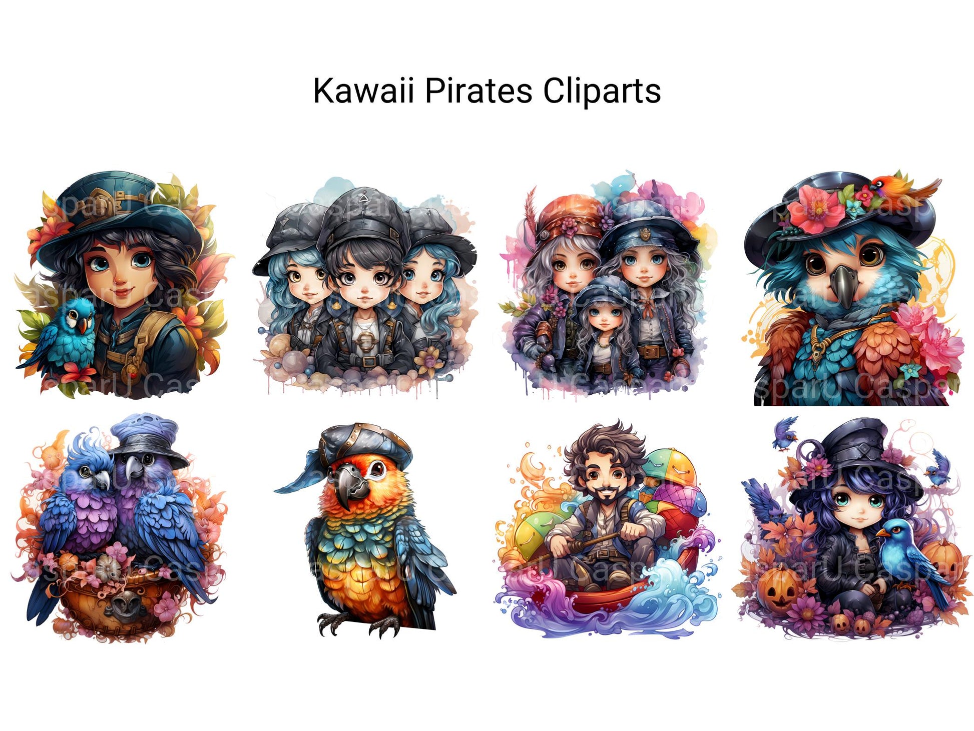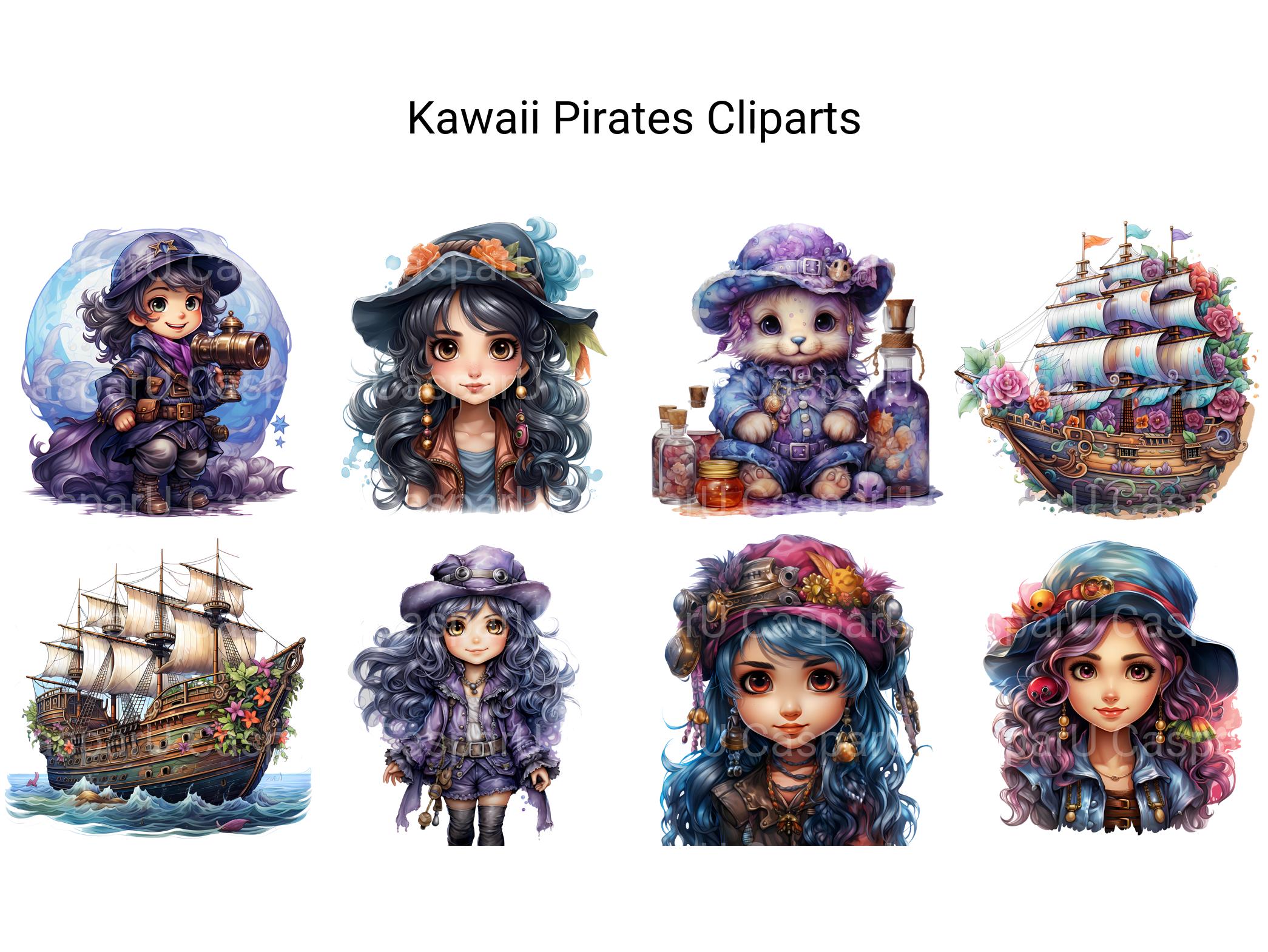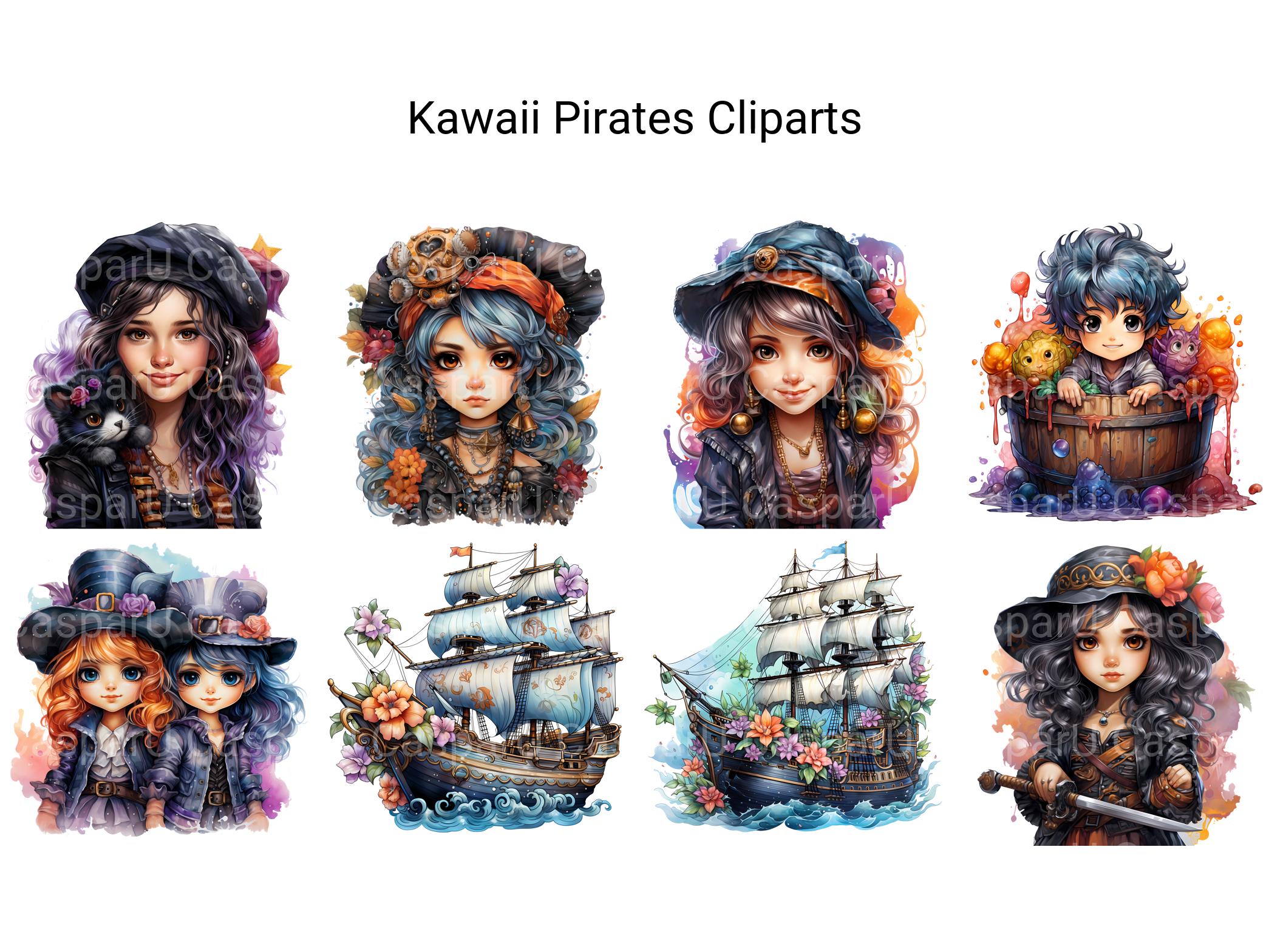 Set sail on a swashbuckling adventure with Kawaii Pirates clip art. These digital illustrations feature adorable pirate characters, treasure chests, and nautical elements, perfect for adding a sense of whimsy and adventure to your projects, whether for children's books, pirate-themed parties, or adventurous designs, captivating viewers with their piratey charm.