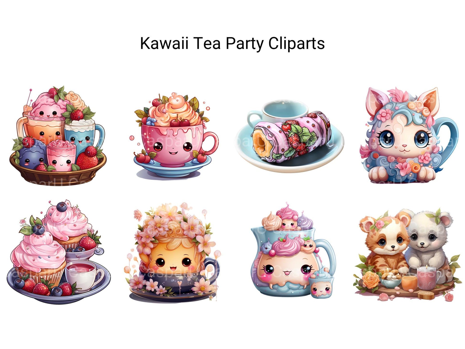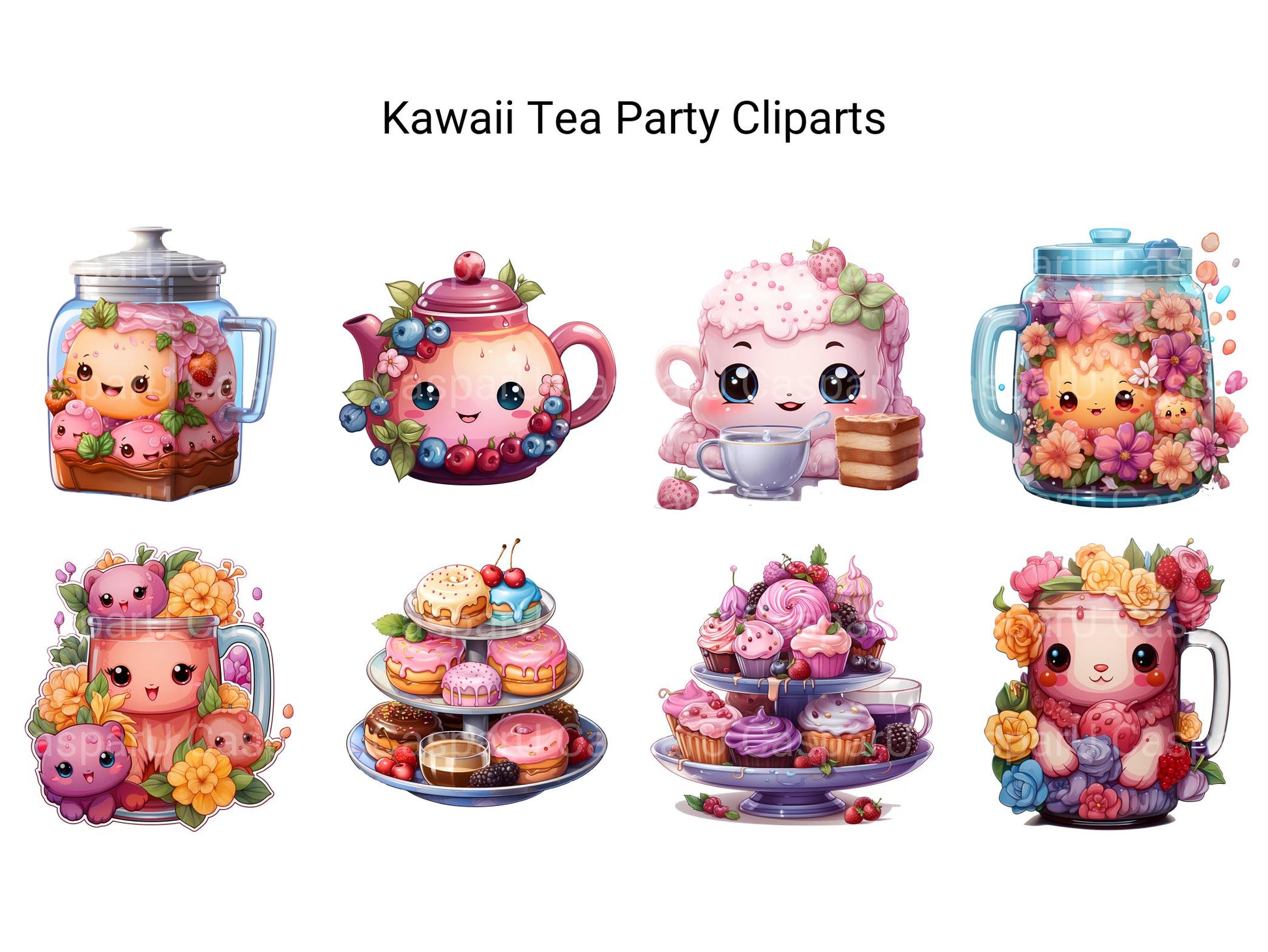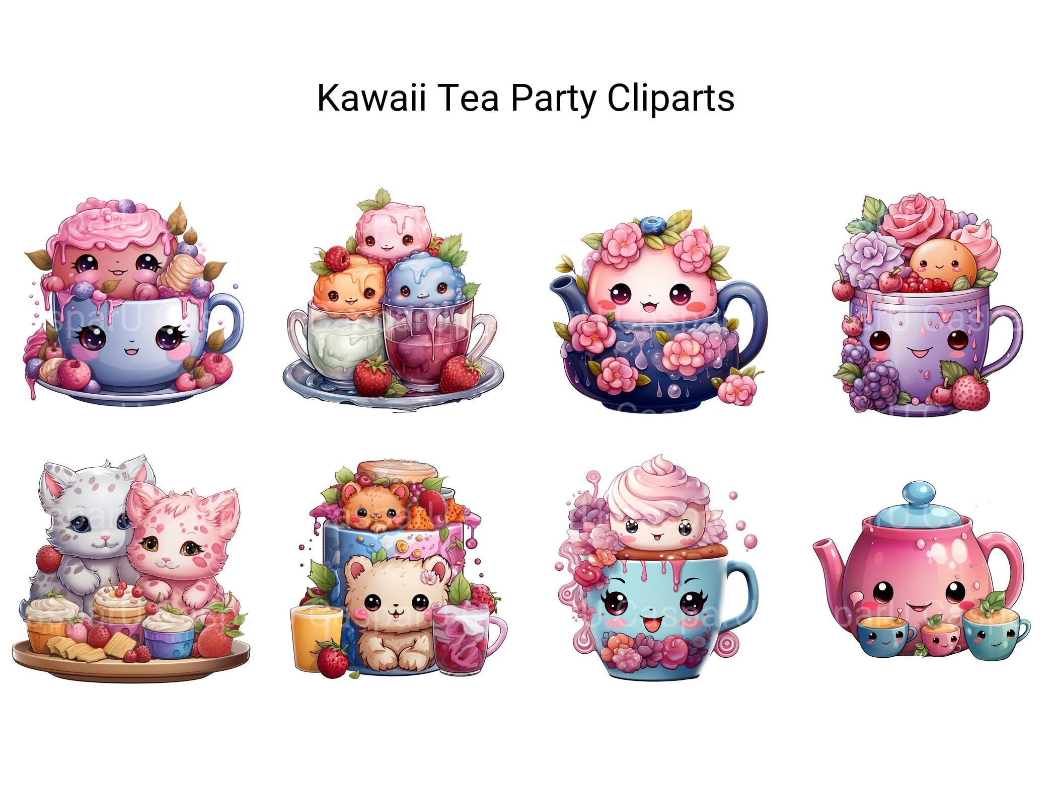 Indulge in the sweetness of Kawaii Tea Party clip art. These digital illustrations showcase cute characters enjoying a charming tea party with delightful treats and elegant decor, perfect for adding a touch of elegance and whimsy to your projects, whether for invitations, greeting cards, or vintage-themed designs, inviting viewers to join in the enchanting tea time fun.
