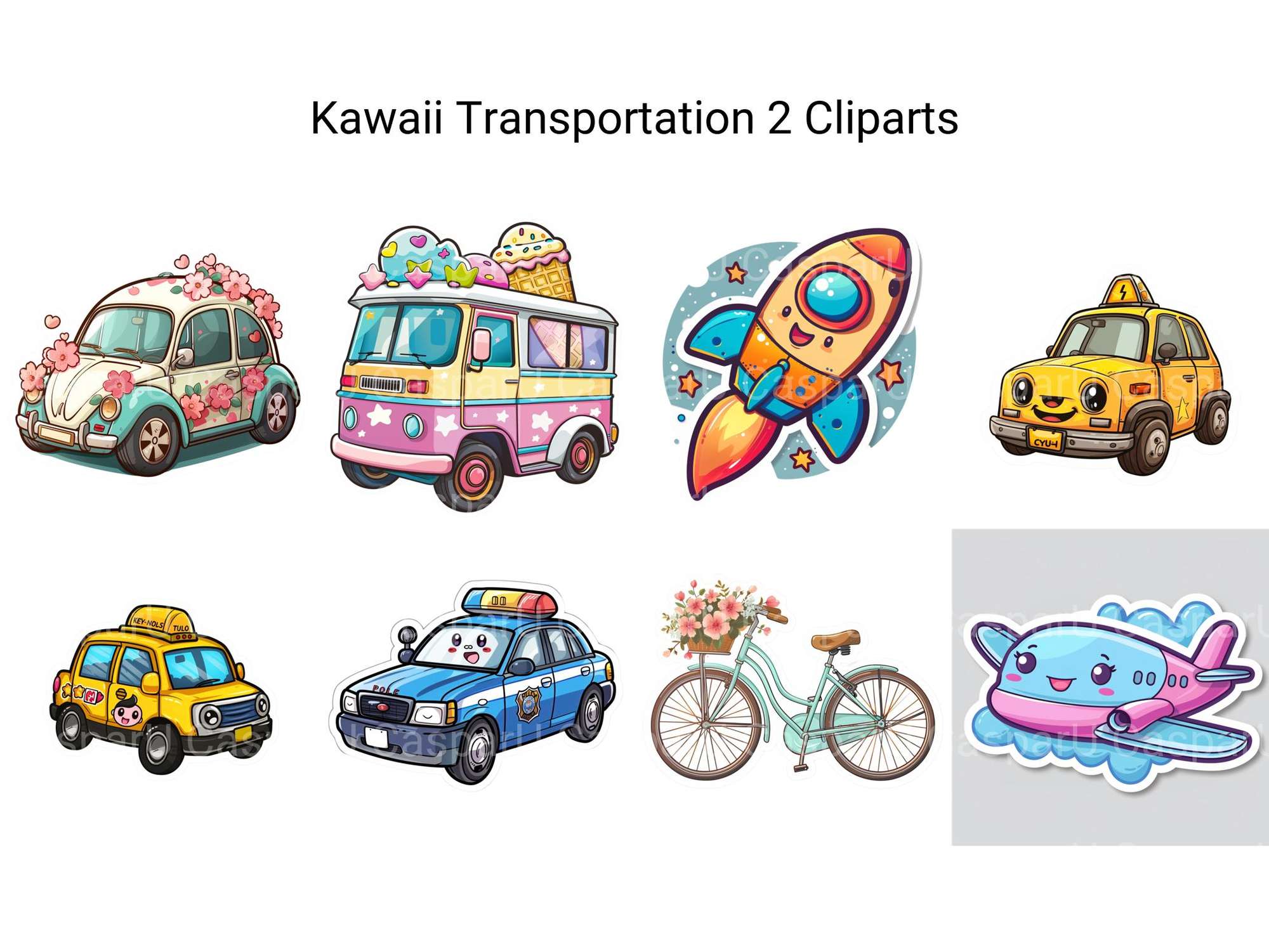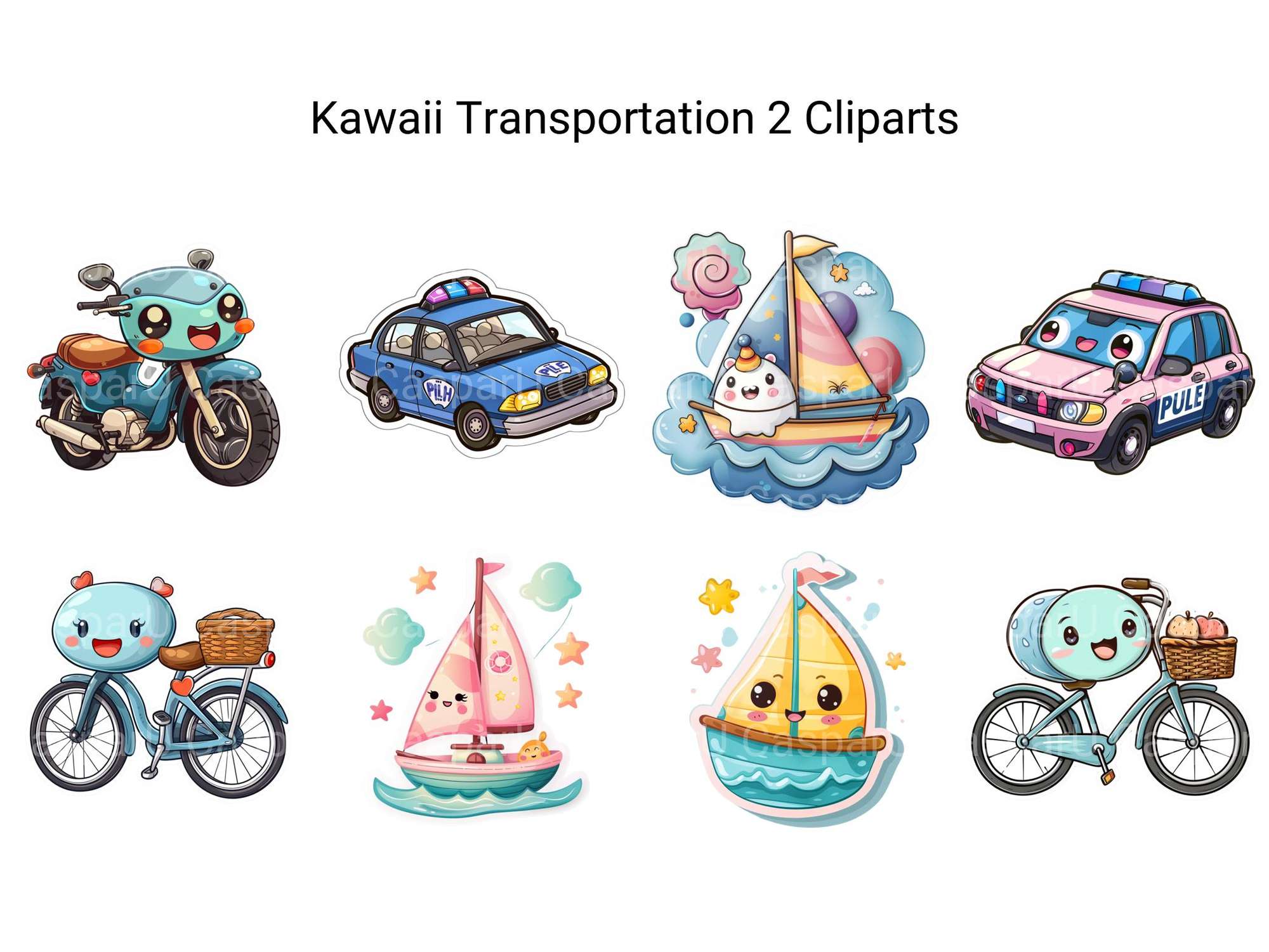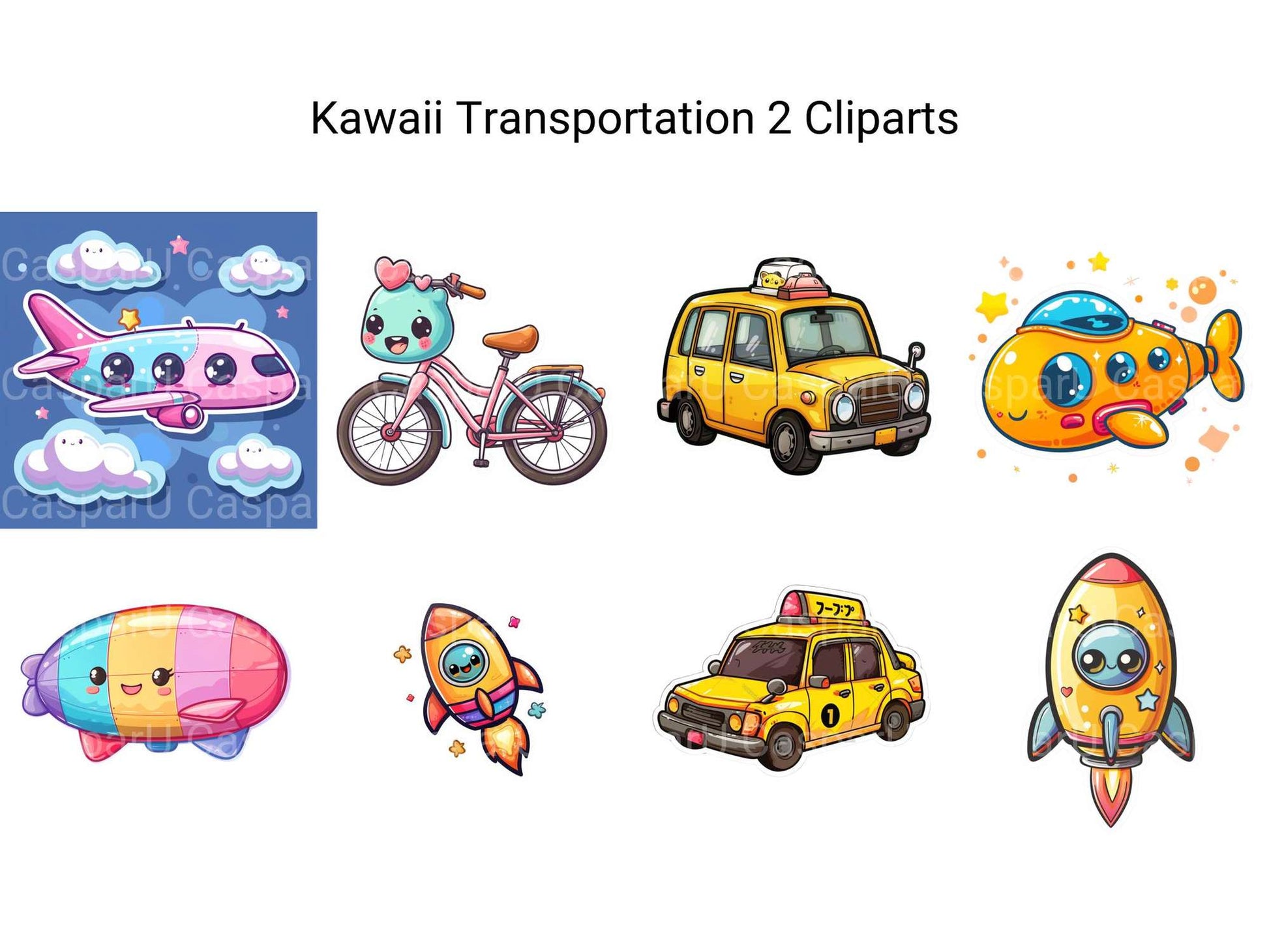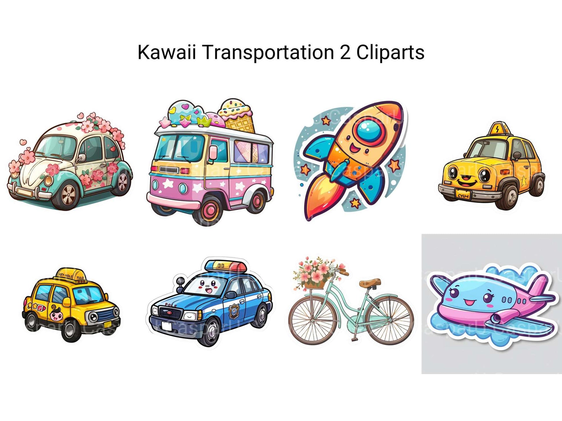 Travel more with this Kawaii Transportation Clipart set, offering extra cute vehicle designs, perfect for fun crafts.