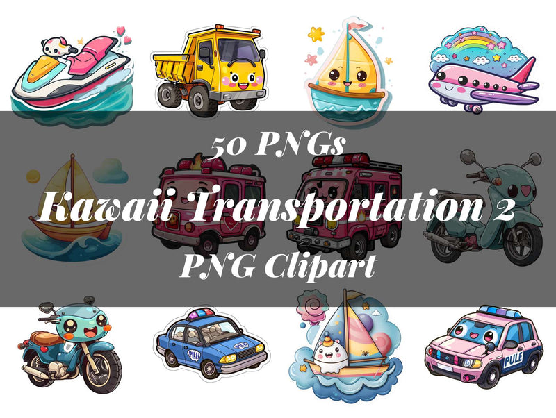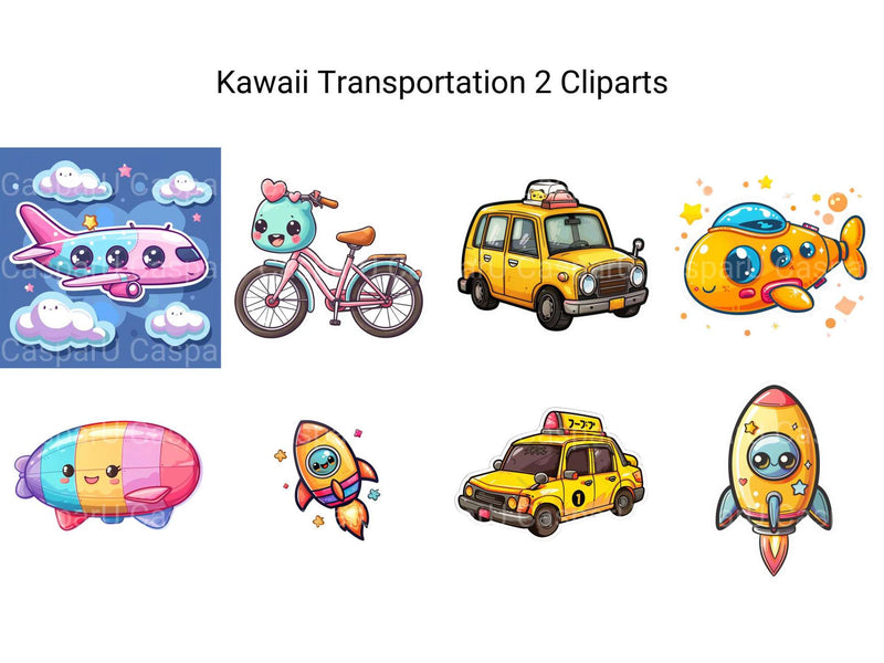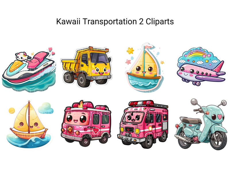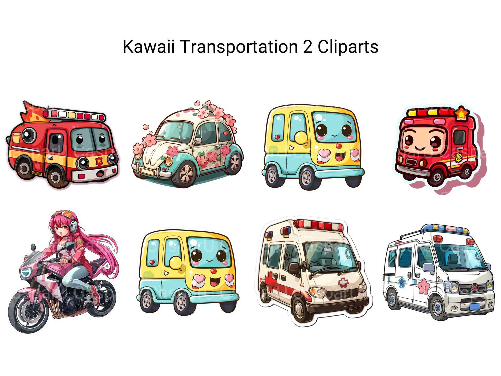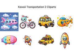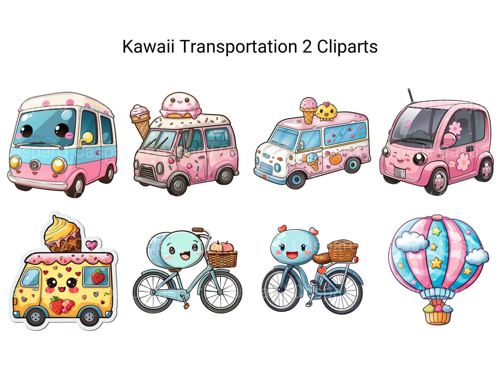 Travel more with this Kawaii Transportation Clipart set, offering extra cute vehicle designs, perfect for fun crafts.