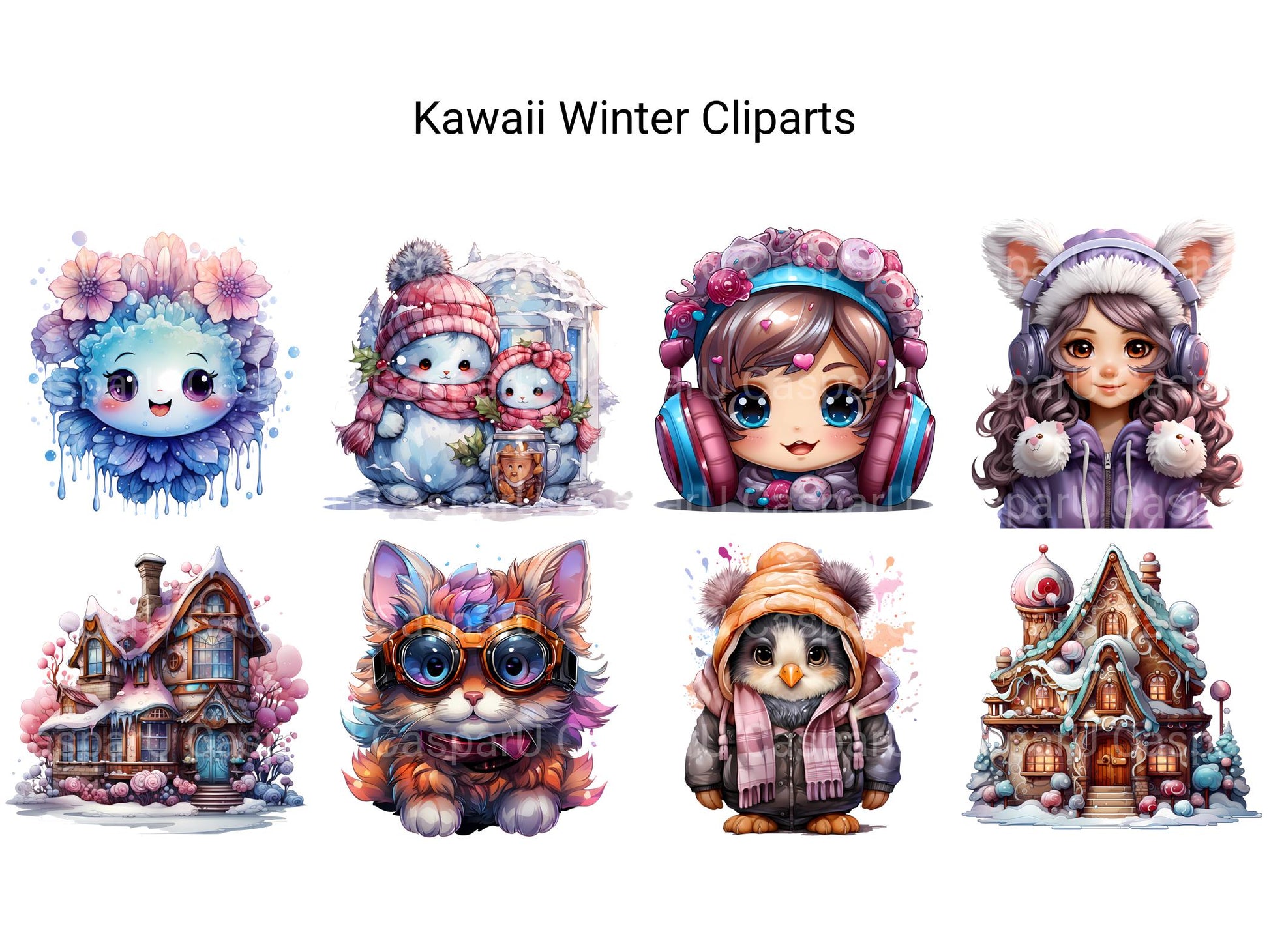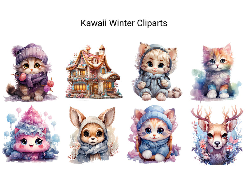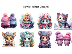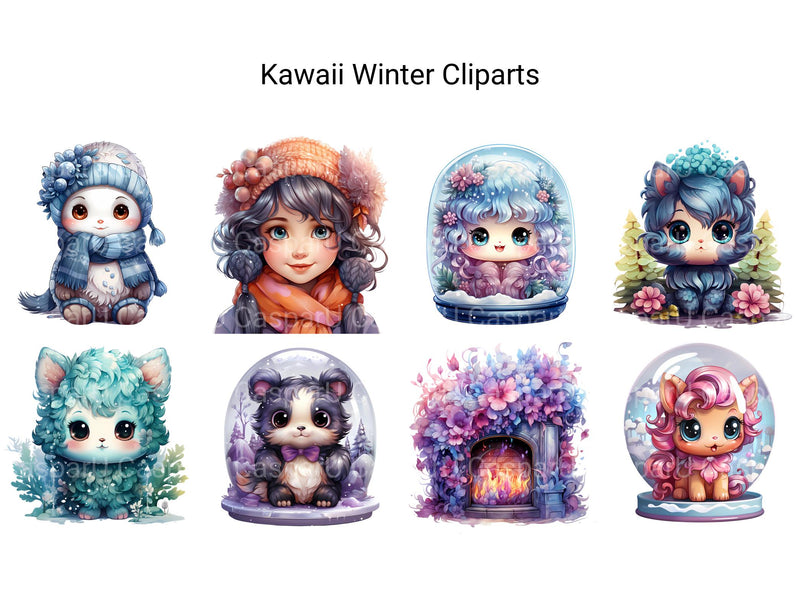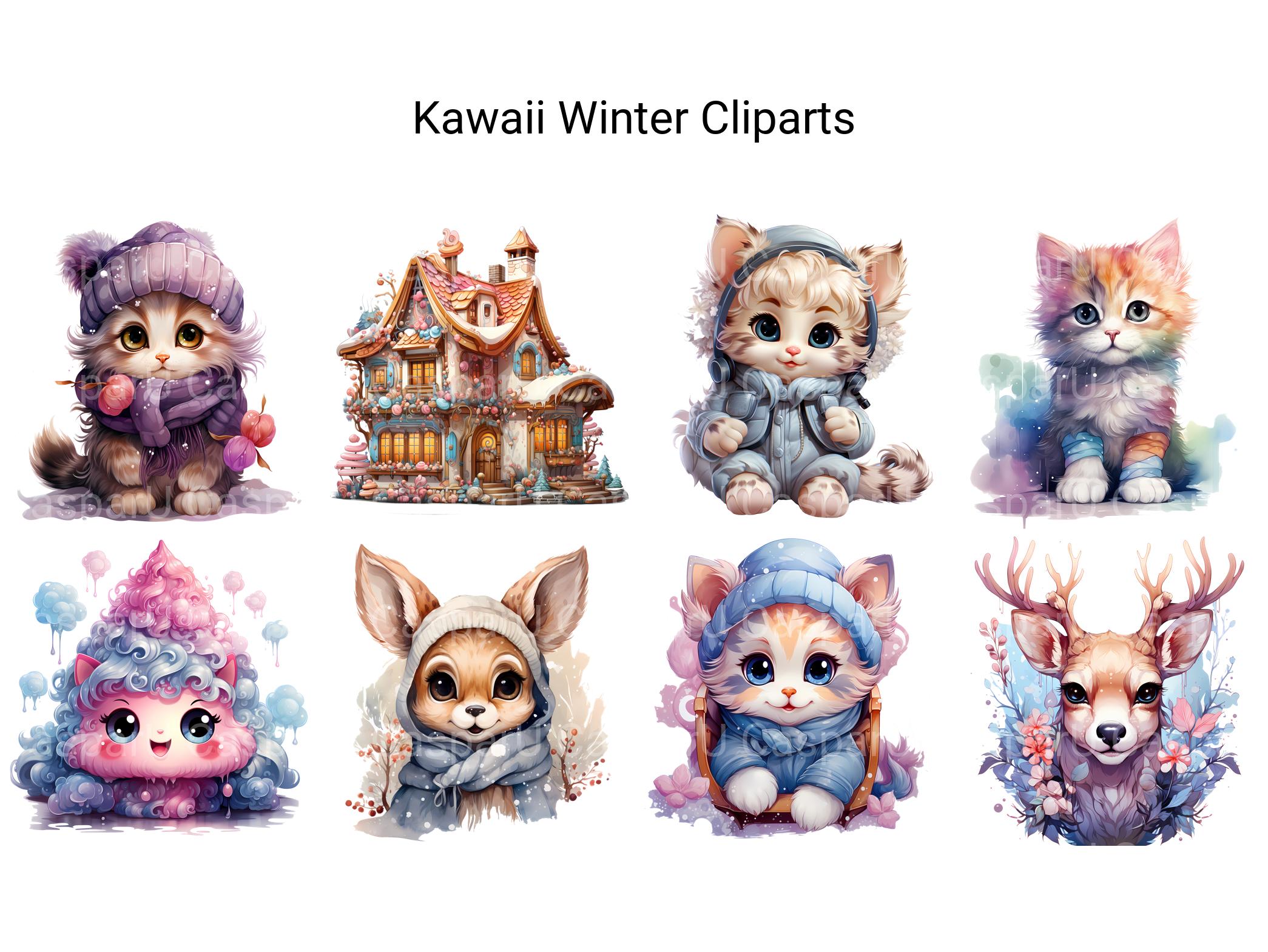 Embrace the enchanting chill of Kawaii Winter clip art. These digital illustrations feature cute characters bundled up in scarves, hats, and mittens, surrounded by snowy landscapes and festive winter scenes, perfect for adding a touch of seasonal charm and joy to your projects, whether for holiday cards, seasonal decor, or cozy winter-themed designs, spreading warmth with their winter wonder.