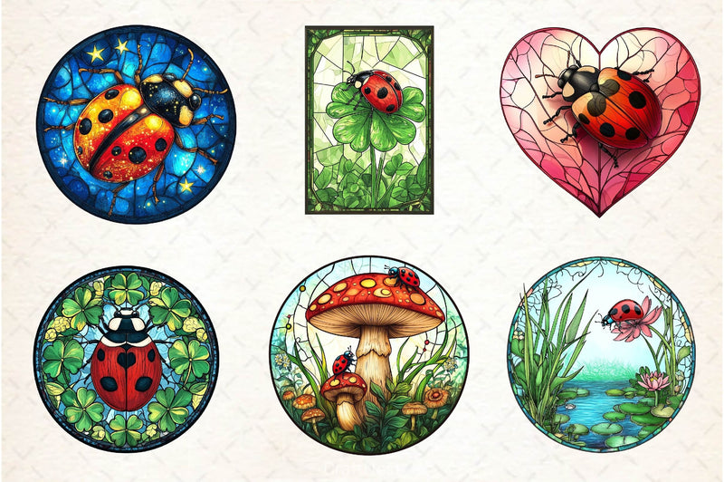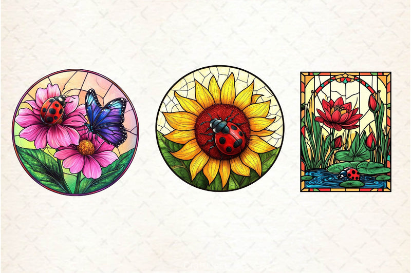 Beautiful ladybug designs in stained glass style for artistic nature projects.