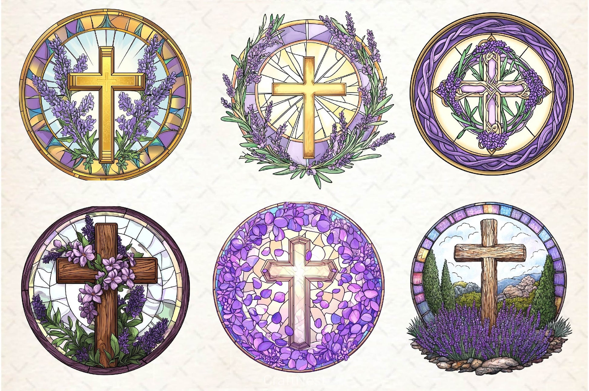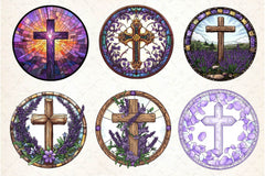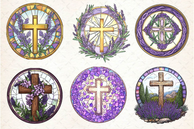 Lavender Blessing & Cross Faux Stained Glass Clipart Bundle