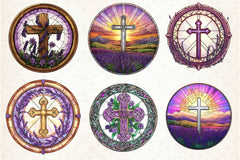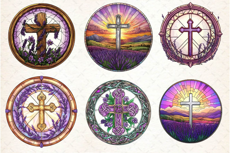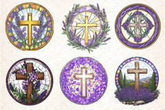 Spiritual lavender cross designs in stained glass style for religious projects.