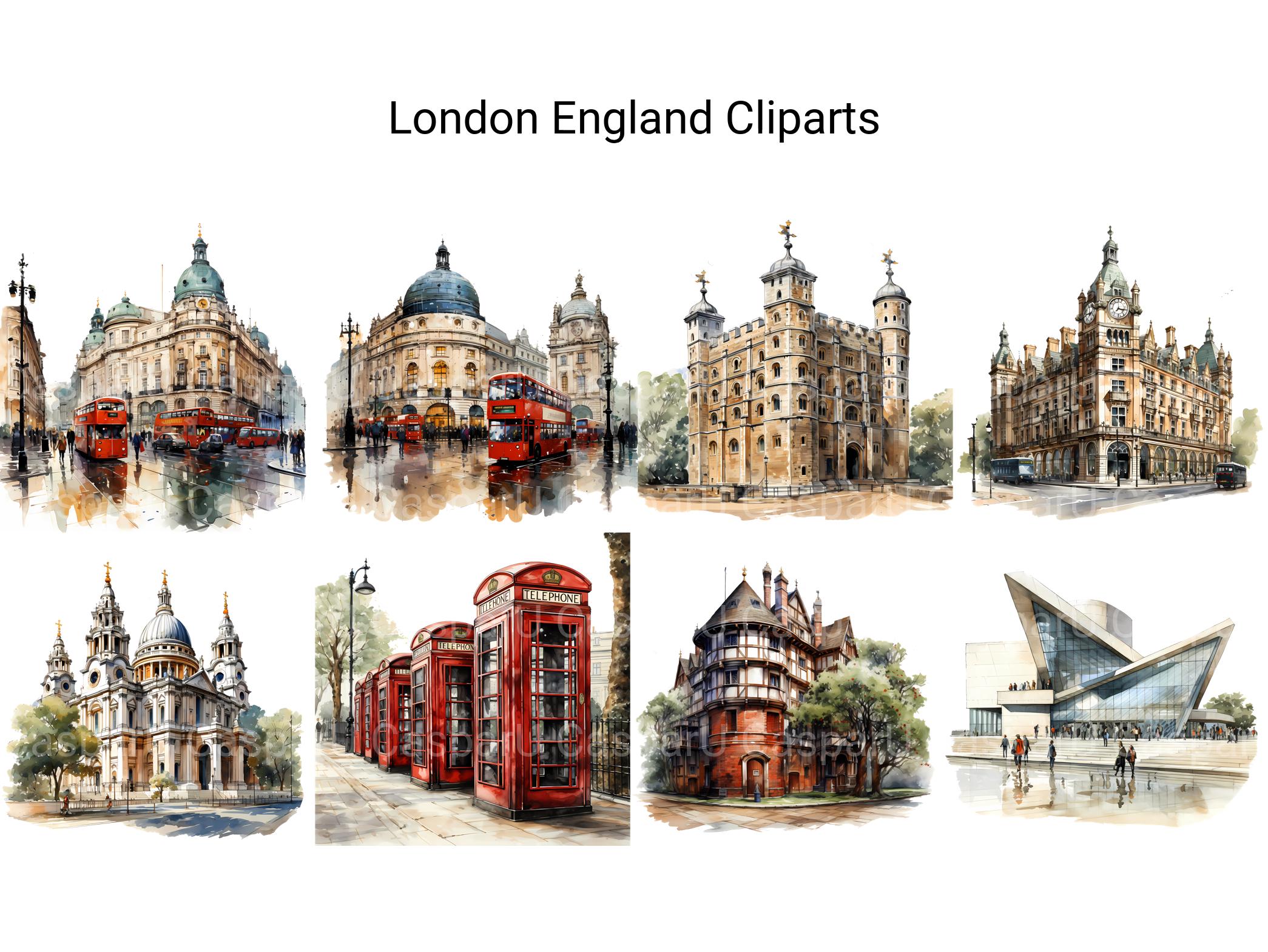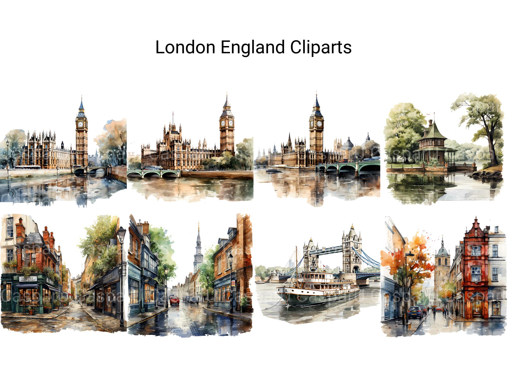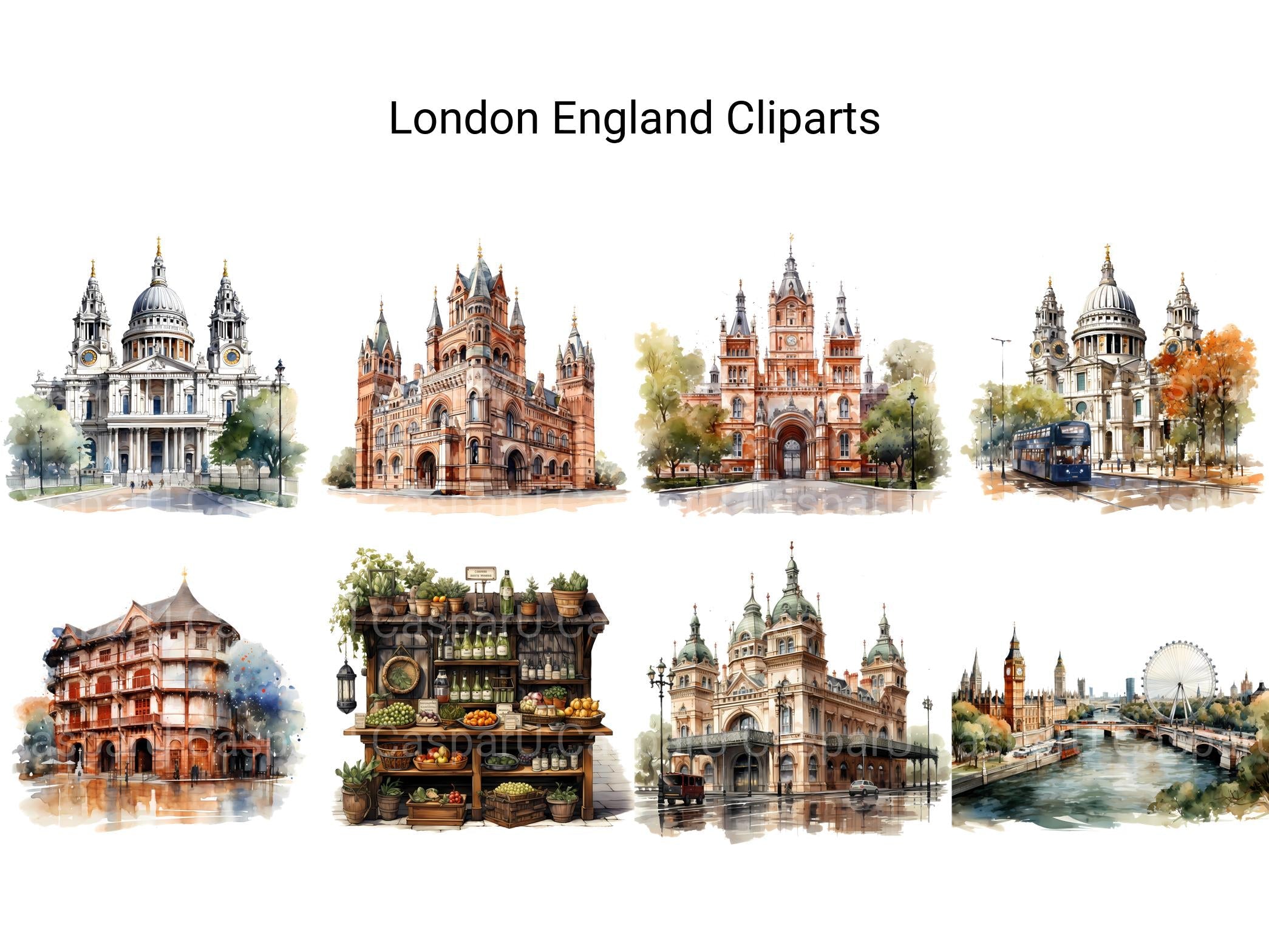 Delve into the dynamic cityscape of London, England, with digital clip art featuring its historic landmarks, bustling streets, and cultural icons. From the majestic Tower Bridge to the iconic red double-decker buses, these illustrations capture the timeless allure and cosmopolitan energy of London, perfect for adding a touch of British charm to your projects, whether for travel guides, city maps, or promotional materials, inviting viewers to experience the vibrant spirit of one of the world's most beloved cities.
