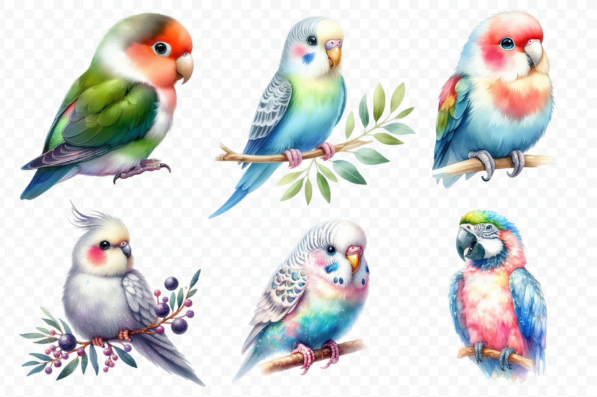 Romantic lovebird pairs perfect for Valentine's Day and bird projects.