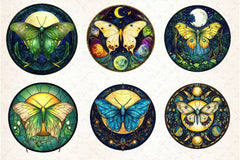 Mystical lunar moth and moon designs in stained glass style for celestial projects.