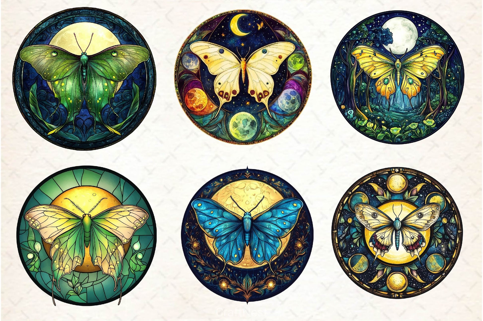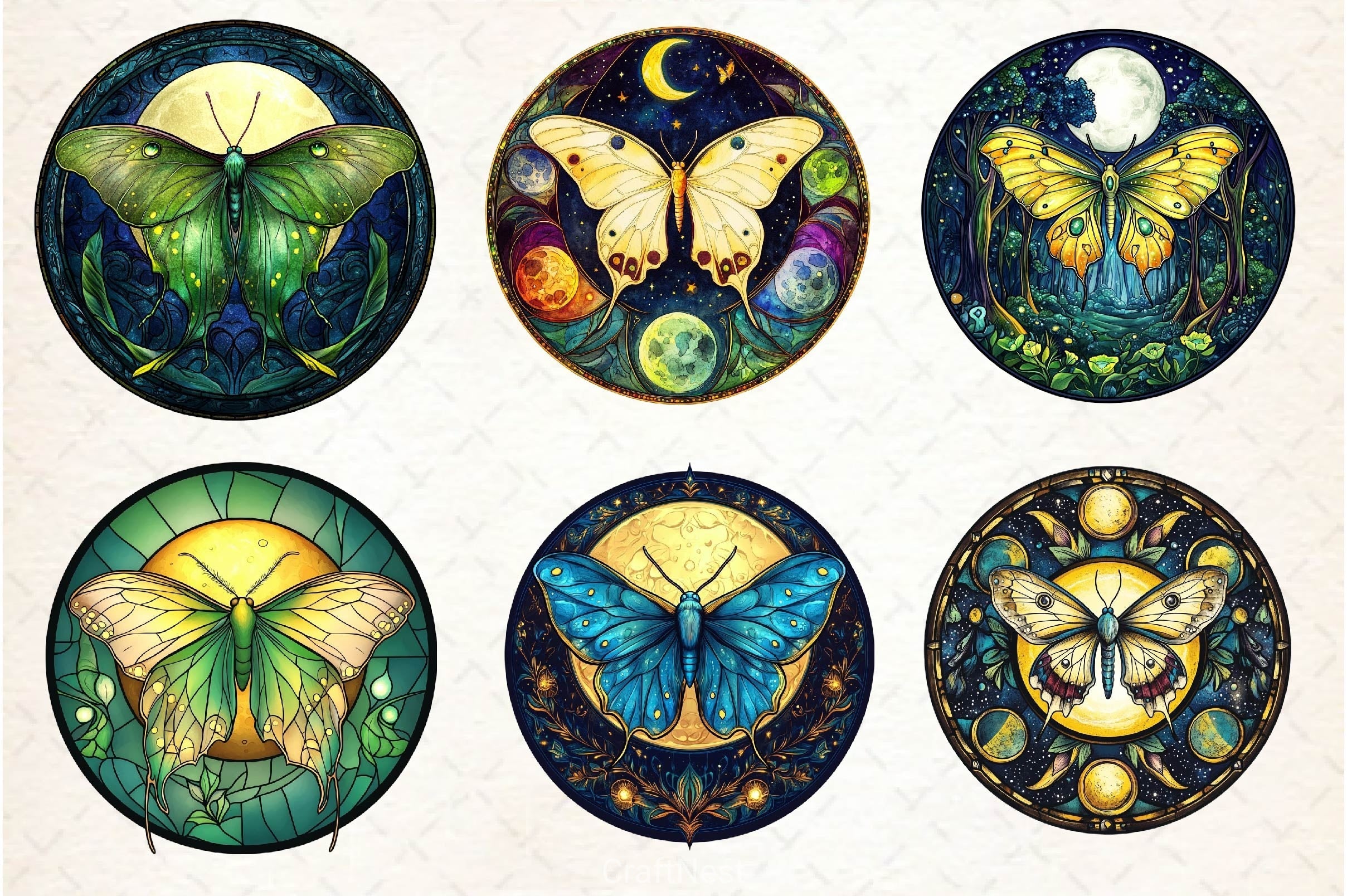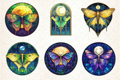 Lunar Moth And Moon Round Stained Glass Clipart Bundle 2