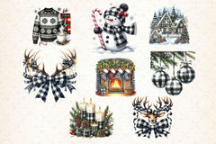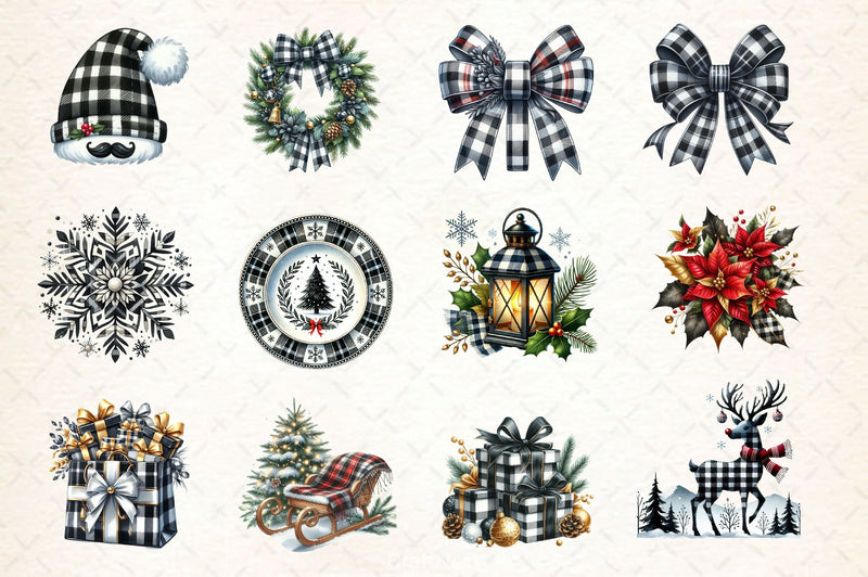 Pattern with this Luxury Plaid Black White Christmas Clipart Bundle, featuring elegant checkered holiday designs, perfect for sophisticated Christmas crafts.