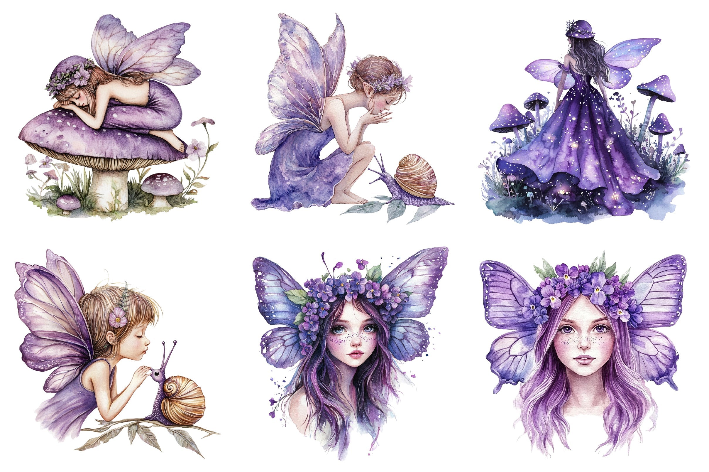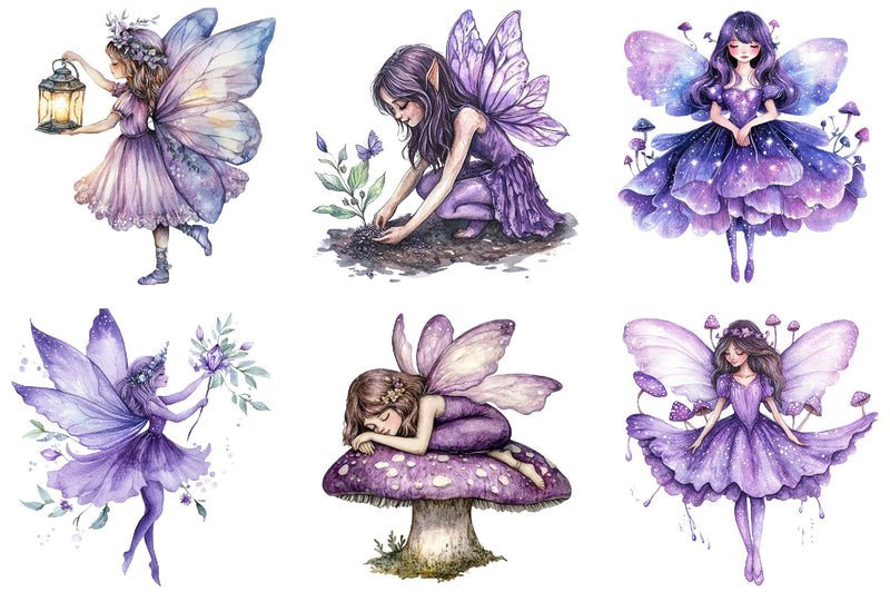 Transform your creative ideas with this delightful collection of purple fairies, ideal for scrapbooking, invitations, and magical garden scenes.