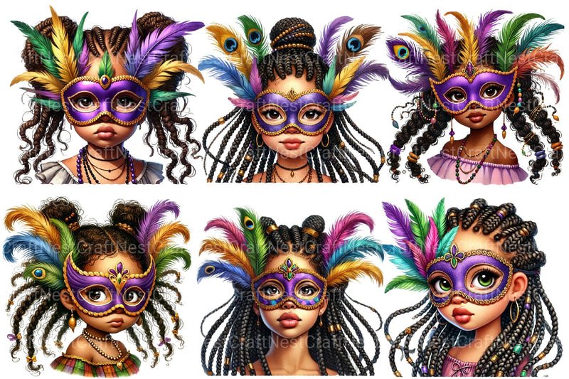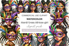Celebrate with this Mardi Gras African Girl Clipart Bundle, featuring beautiful African girl designs, perfect for diverse carnival crafts.