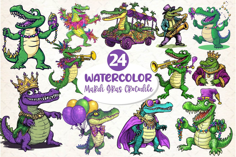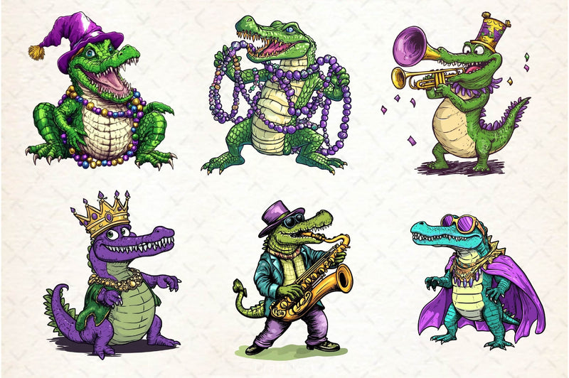 Party with this Mardi Gras Crocodile Clipart Bundle, featuring festive reptile designs, perfect for carnival animal crafts.