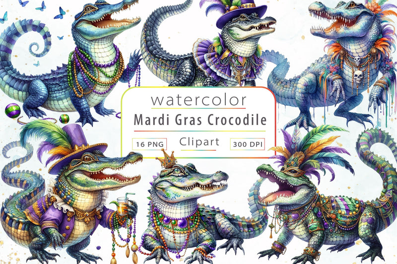Party with this Mardi Gras Crocodile Clipart Bundle, featuring festive reptile designs, perfect for carnival celebration crafts.