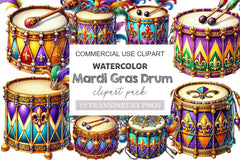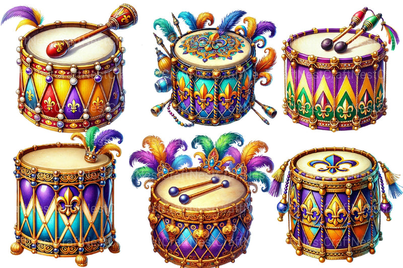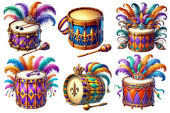 Beat with this Mardi Gras Drum Clipart Bundle, featuring carnival drum designs, ideal for festive music crafts.