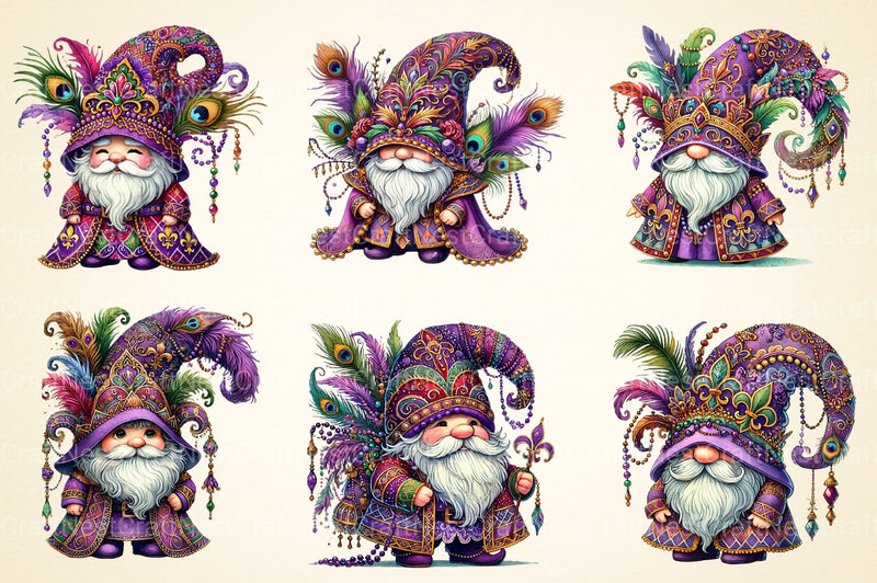 Magic with this Mardi Gras Gnome Clipart Bundle, featuring whimsical gnome designs, ideal for carnival fantasy crafts.