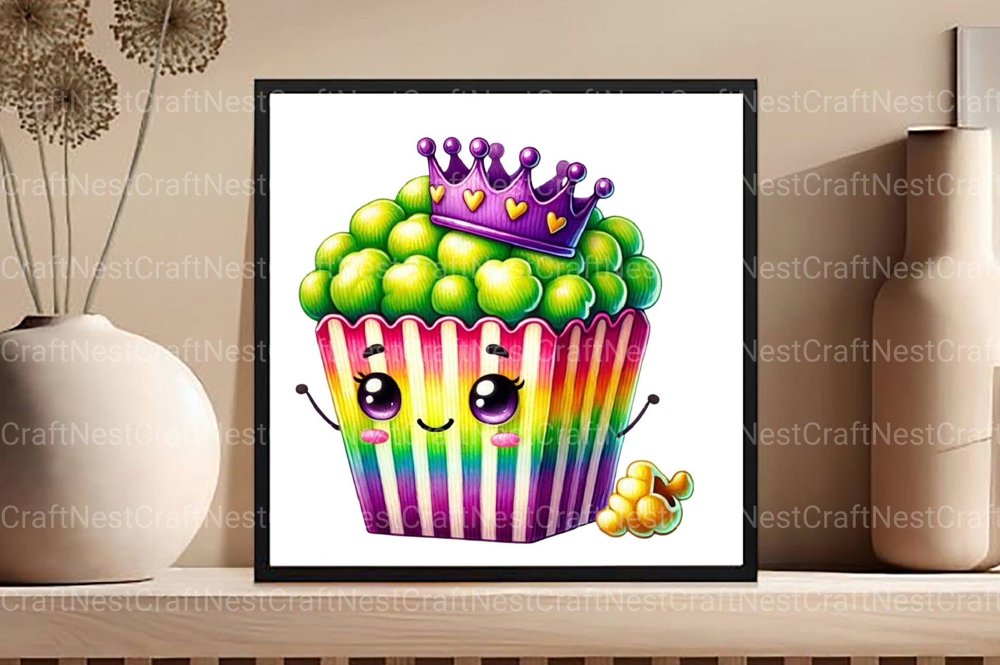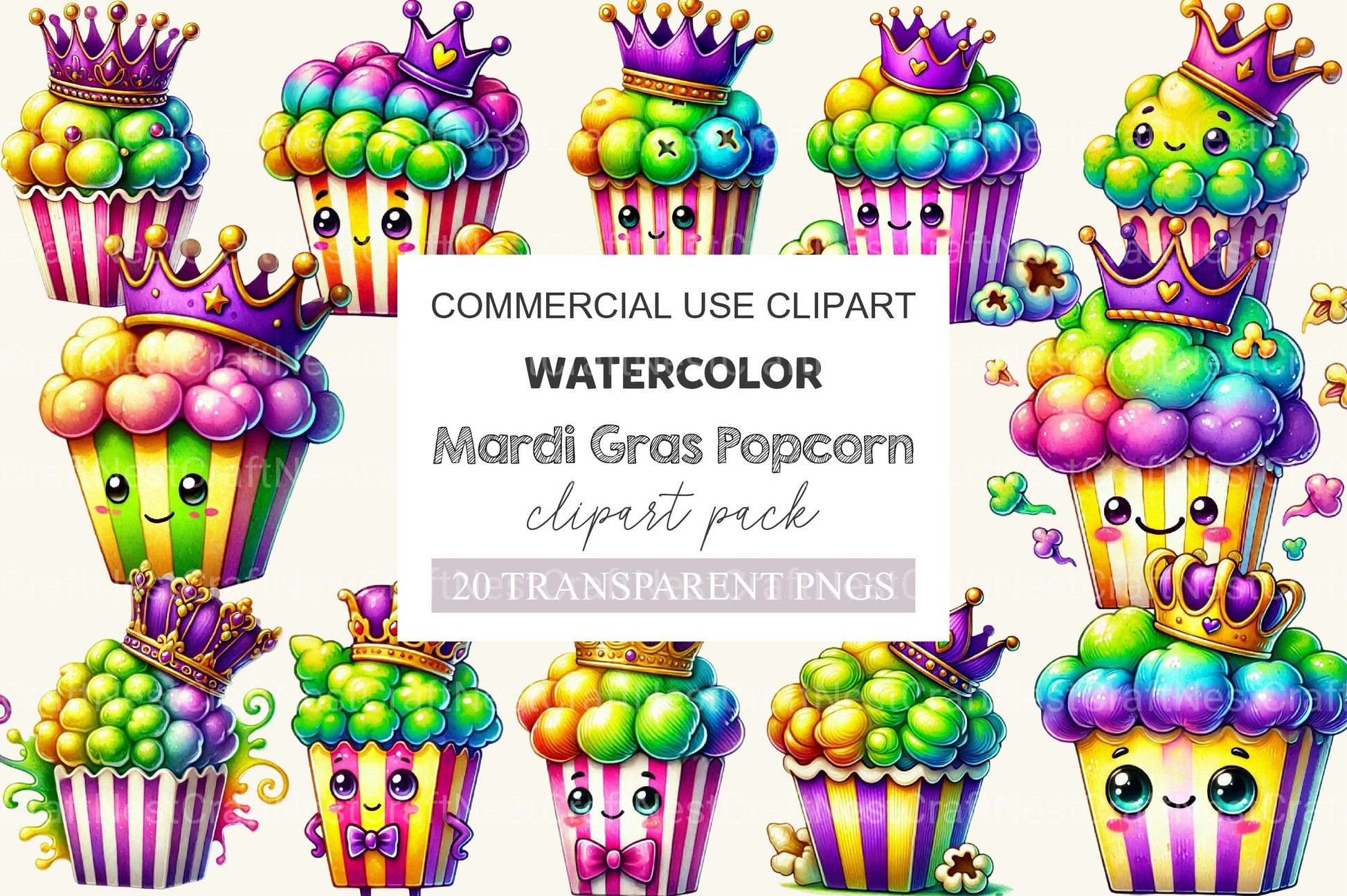 Celebrate with this Mardi Gras Popcorn Clipart Bundle, featuring festive snack designs, perfect for carnival party crafts.