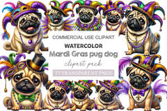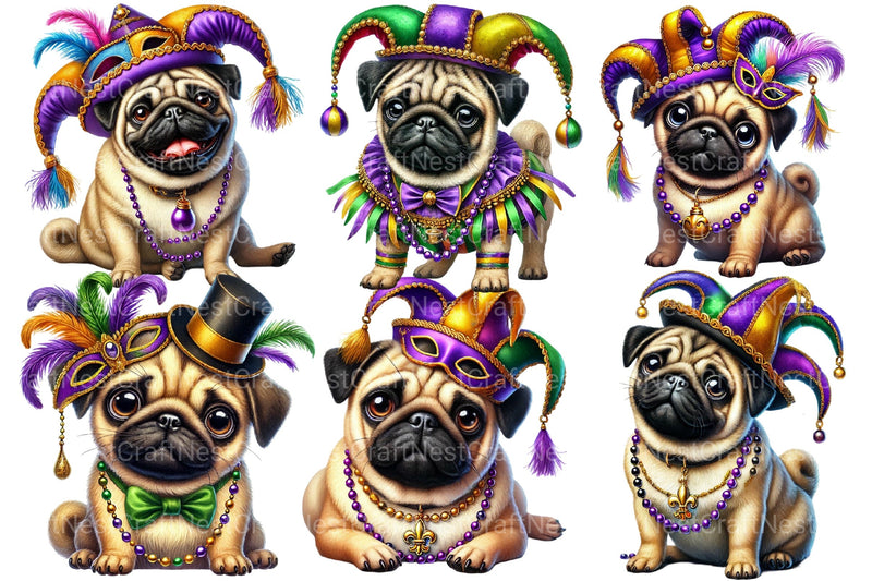 Celebrate with this Mardi Gras Pug Dog Clipart Bundle, featuring festive pug designs, ideal for carnival pet crafts.