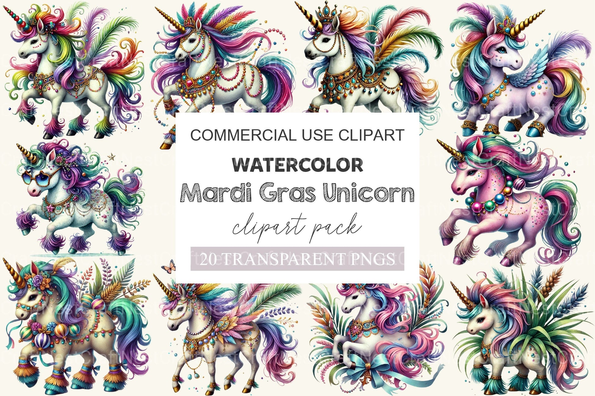 Party with this Mardi Gras Unicorn Clipart Bundle, featuring carnival unicorn designs, ideal for magical celebration crafts.