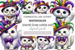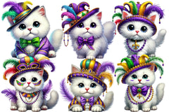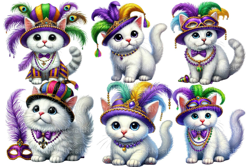 Purr with this Mardi Gras White Cat Clipart Bundle, featuring elegant white cat designs, ideal for classy carnival crafts.