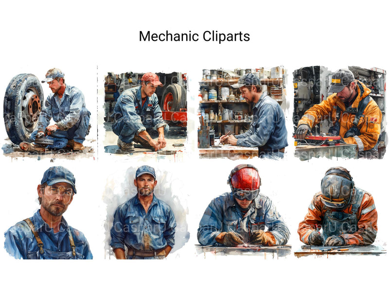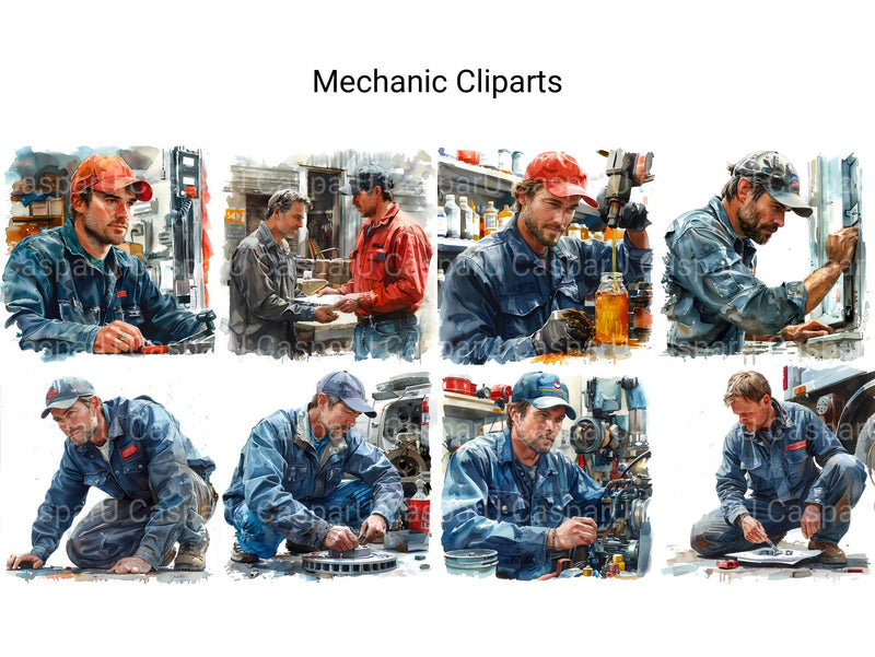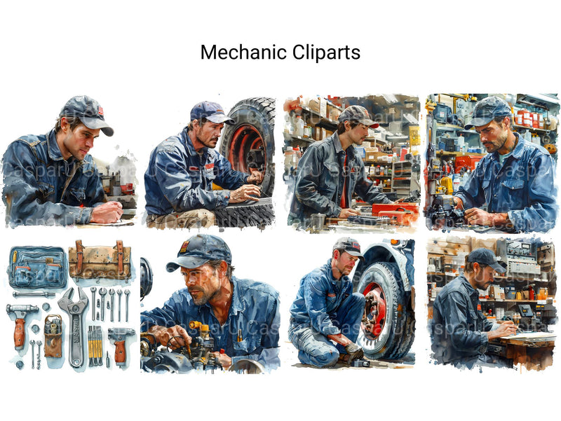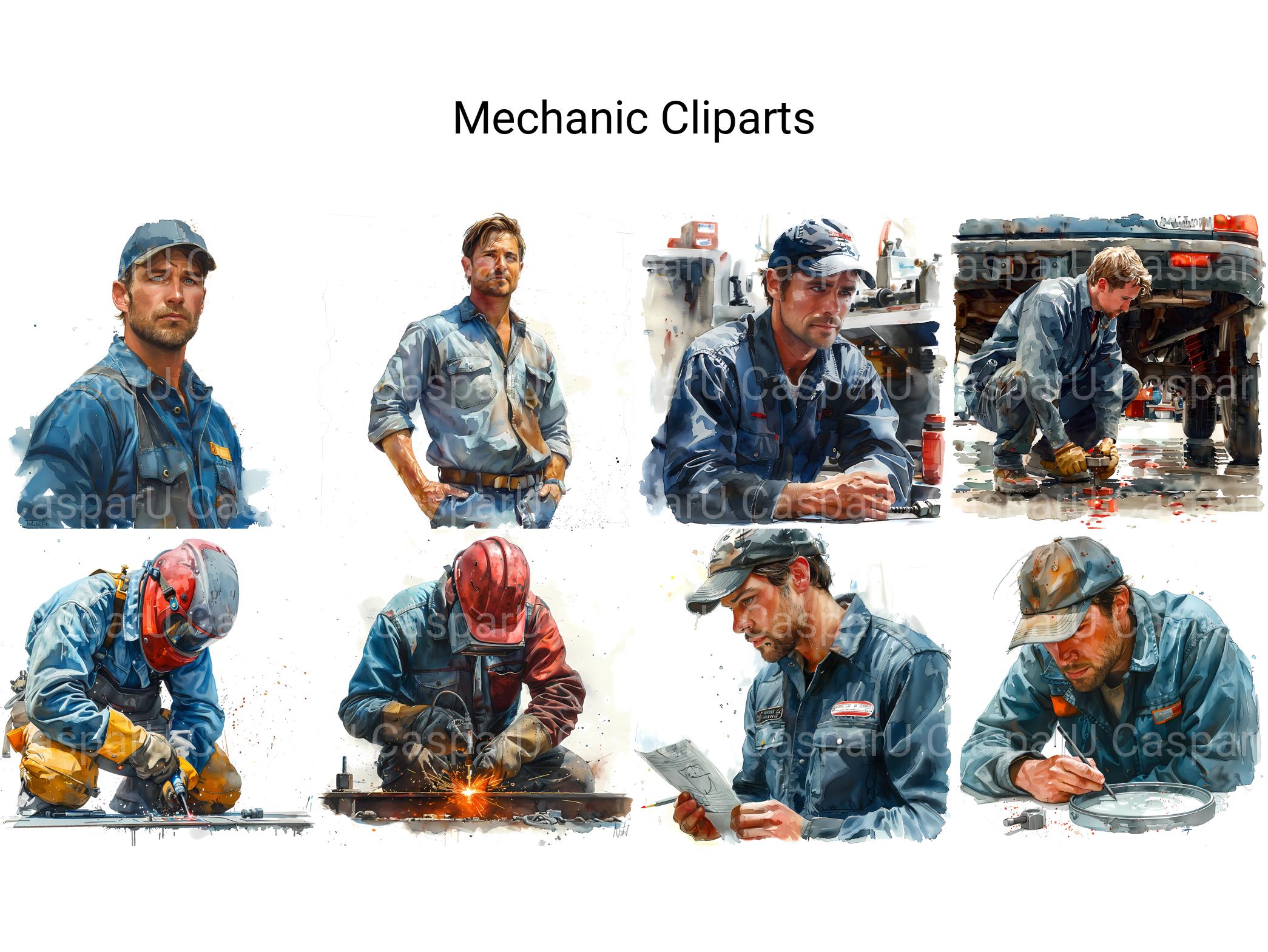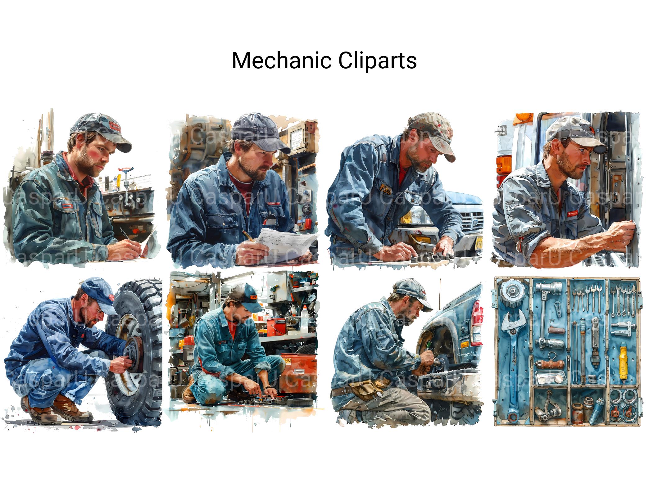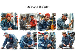 Our mechanic-themed digital cliparts feature tools, car parts, and repair scenes. Perfect for automotive blogs, repair manuals, and technical presentations. These cliparts highlight the skill and expertise of mechanics.
