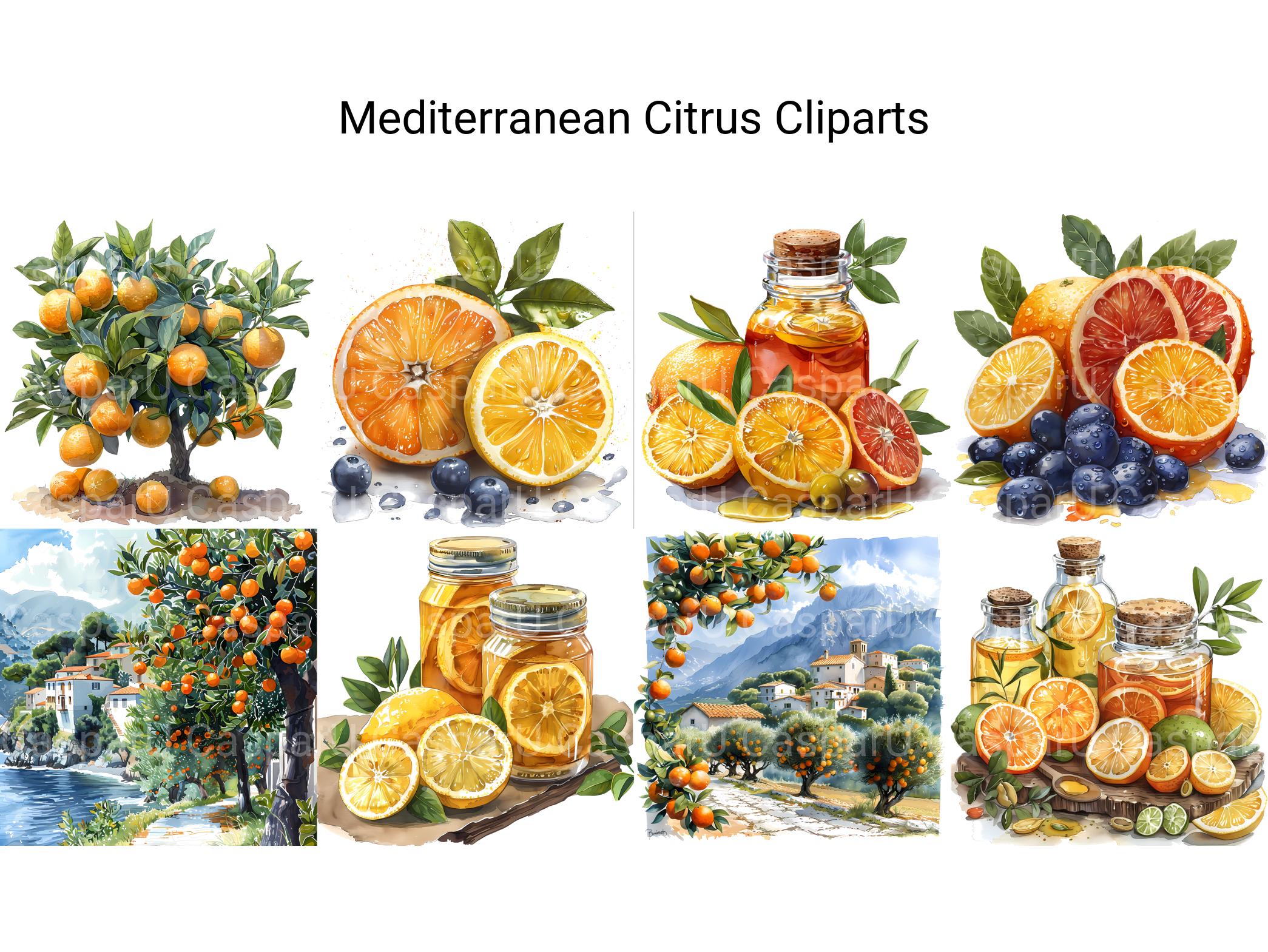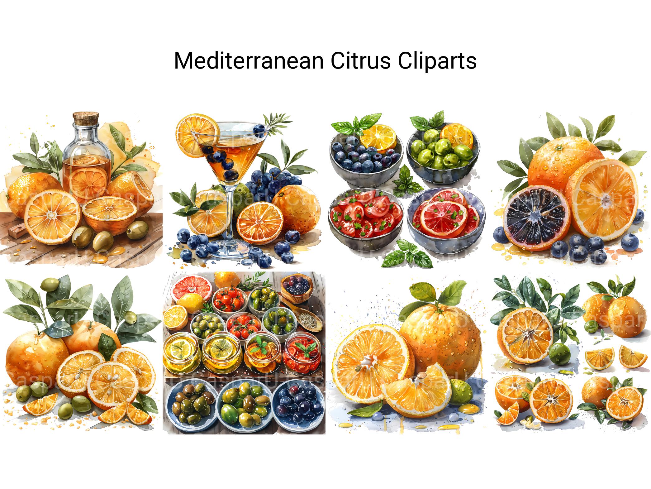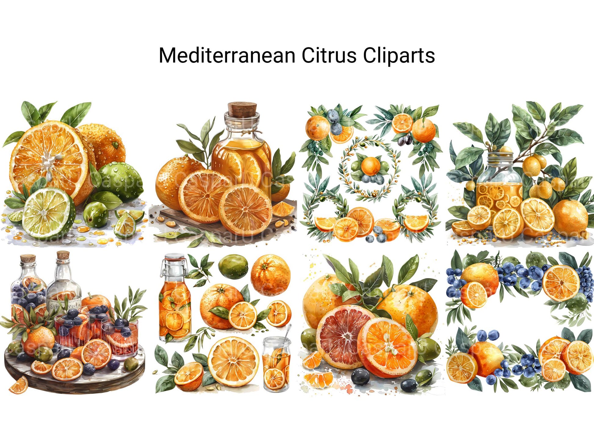 Add a refreshing touch with our Mediterranean Citrus clipart. Featuring a variety of citrus fruits like lemons and oranges in vibrant colors, this set brings a lively and sunny feel to your projects. Ideal for citrus-themed or summer designs.