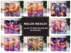 Dive into the refreshing world of melons with our Melon Melody seamless tumbler wrap. Featuring a mix of watermelon, cantaloupe, and honeydew, this design brings a vibrant and juicy touch to your drinkware. Perfect for a fresh, summery look.