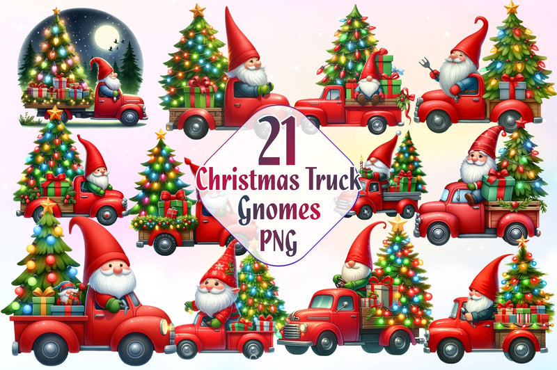 Drive with this Merry Christmas Truck Gnomes Clipart Bundle, featuring festive truck gnome designs, perfect for holiday vehicle crafts.