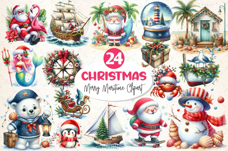 Sail with this Merry Maritime Christmas Clipart Bundle, featuring nautical holiday designs, perfect for ocean Christmas crafts.