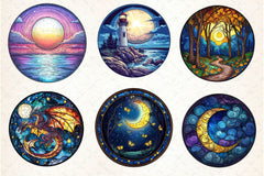 Glow with this Moonlit Nights Stained Glass Circle Clipart Bundle, featuring celestial window designs, perfect for mystical glass crafts.