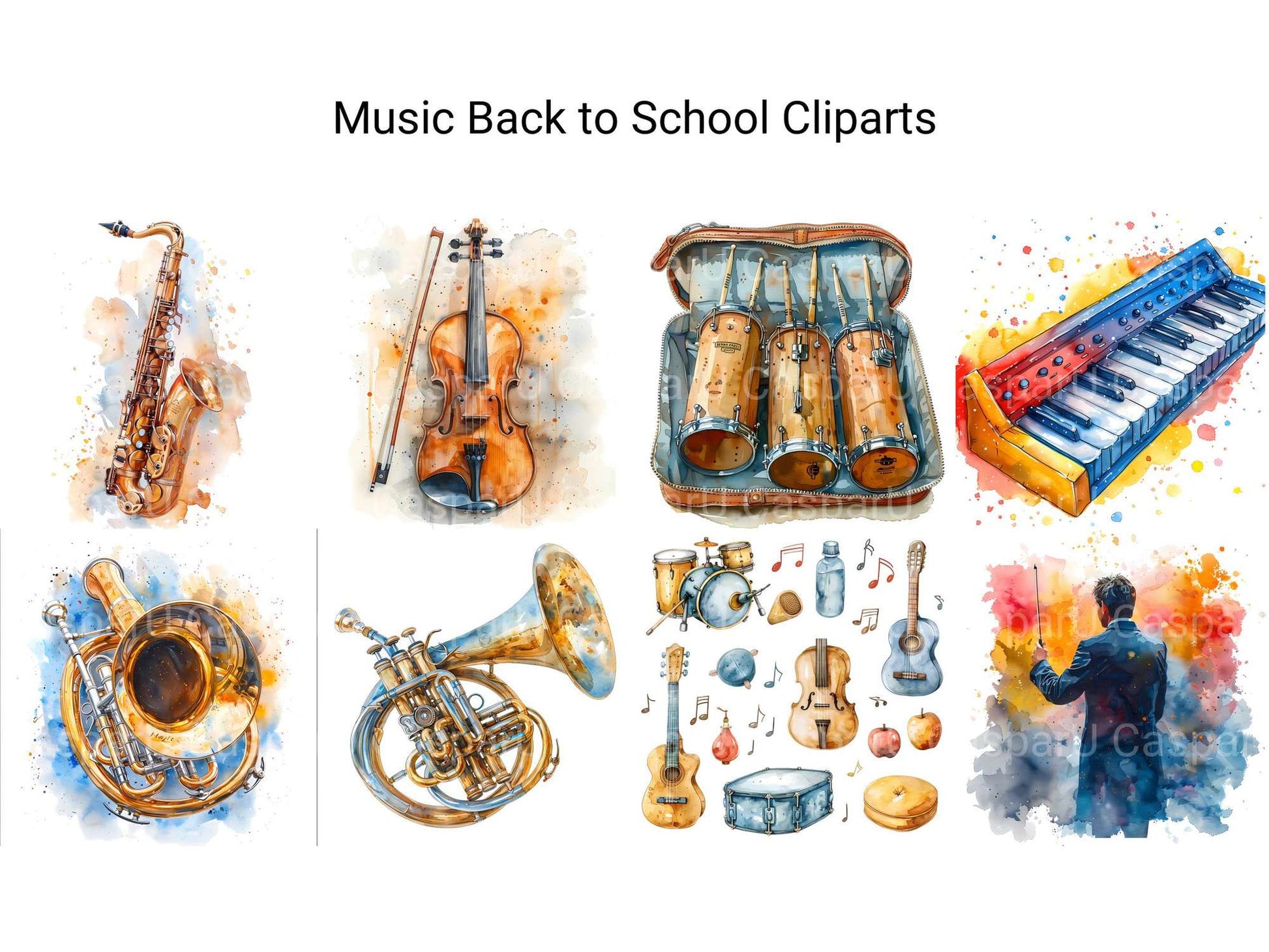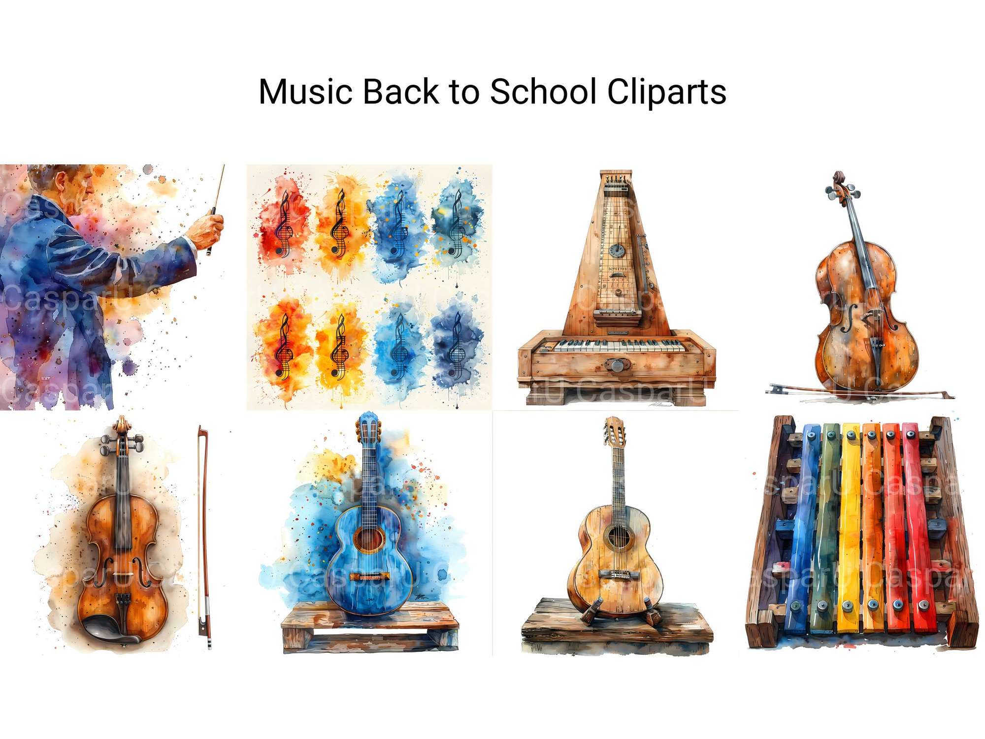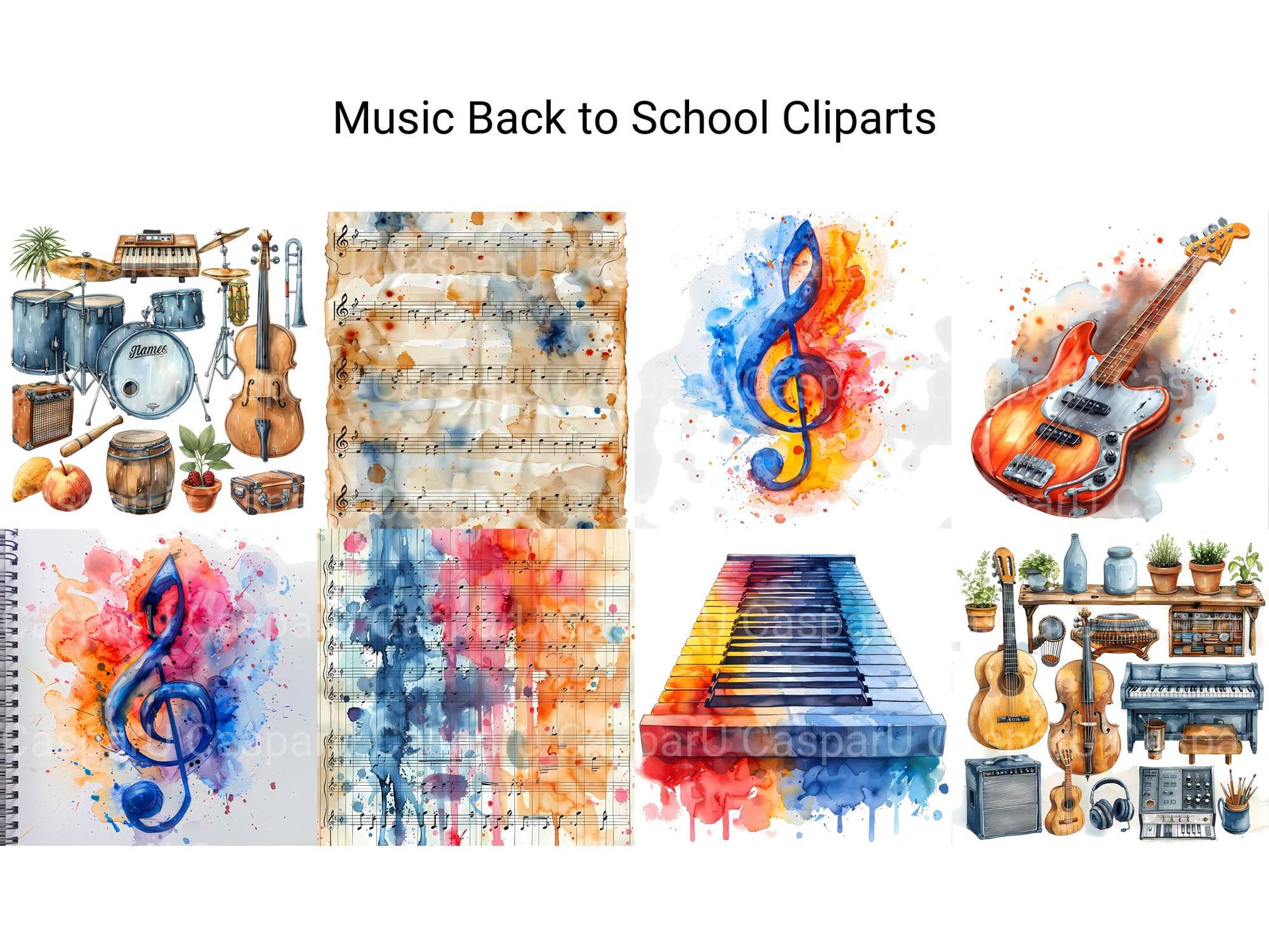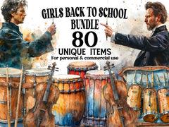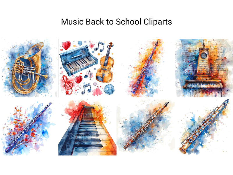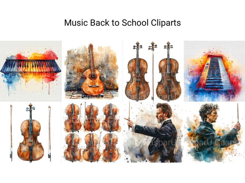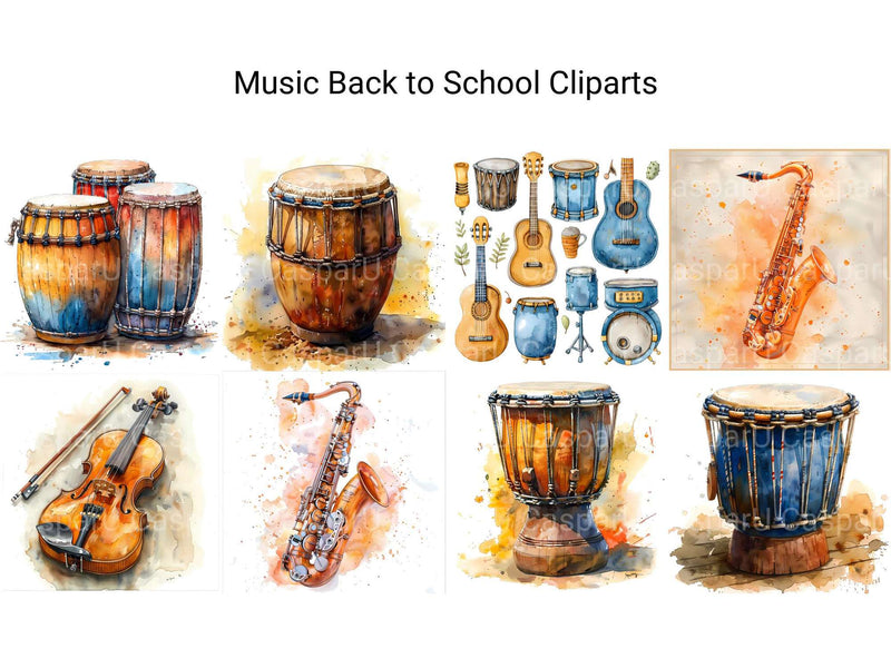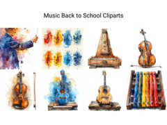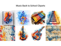 Harmonize your back-to-school projects with music-themed cliparts. These illustrations combine instruments and school elements, perfect for celebrating young musicians heading back to class.