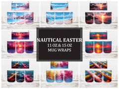 Set sail for Easter fun with our Nautical Easter digital mug wraps. These delightful designs feature charming nautical illustrations and maritime motifs, evoking the spirit of adventure and exploration, making them a perfect addition to your mug collection and a delightful way to infuse your mornings with the breezy charm of Easter by the sea.