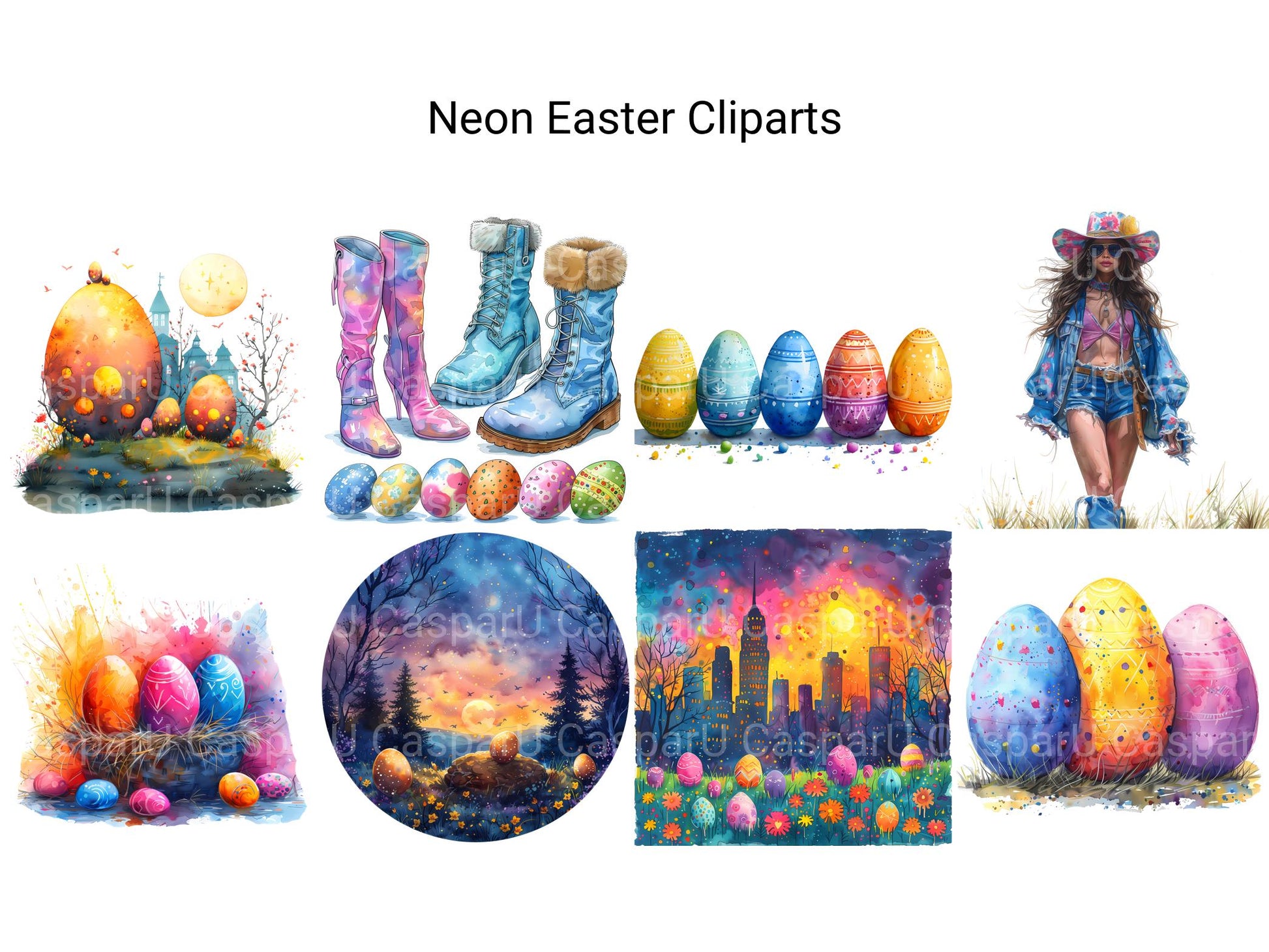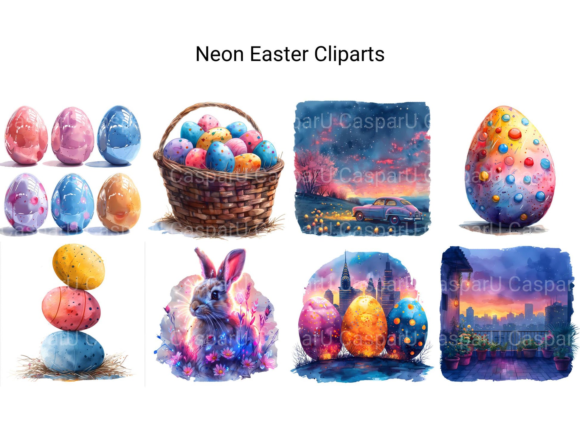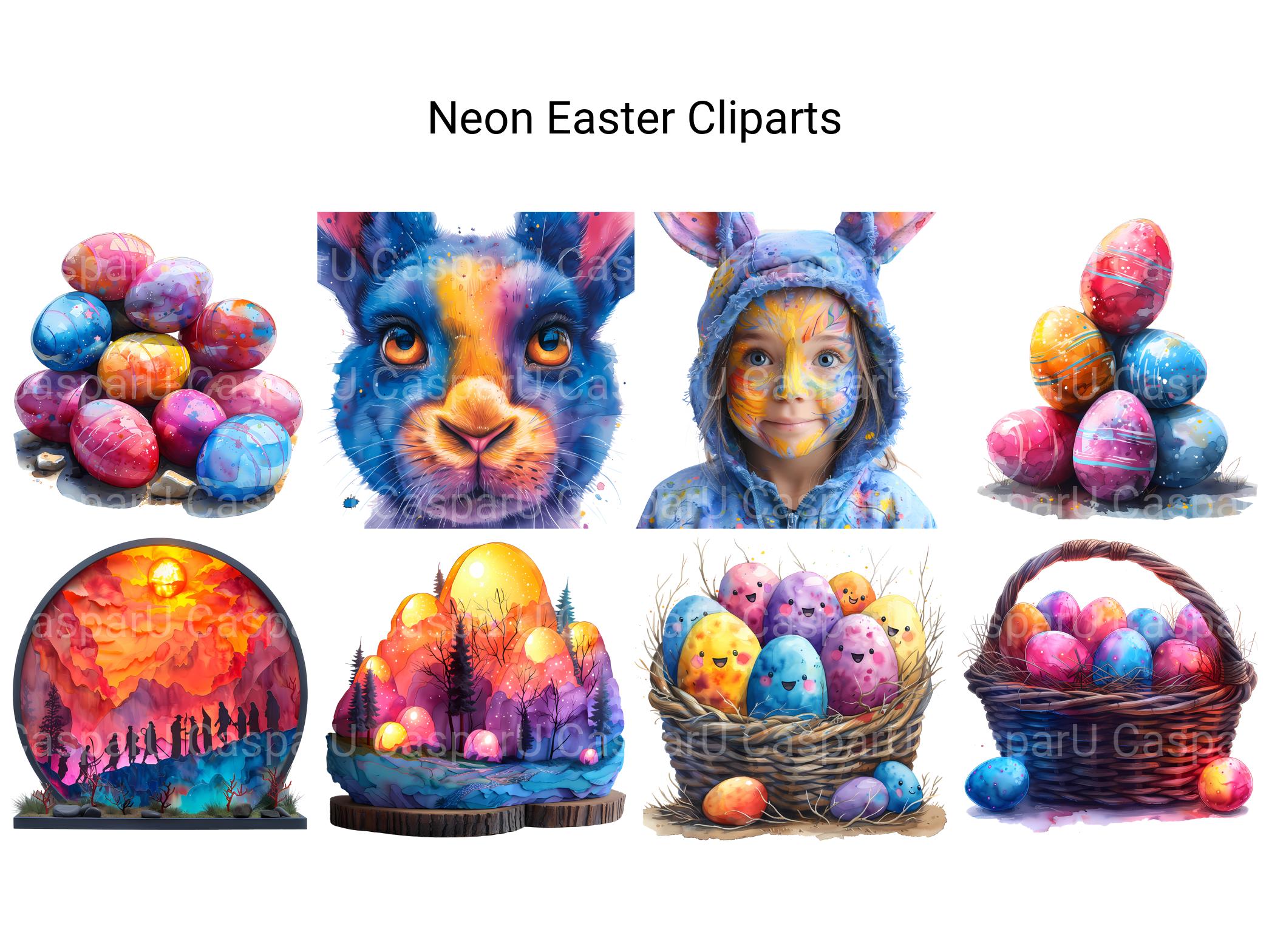 Illuminate your Easter celebrations with Neon Easter digital clip art, featuring vibrant neon colors, bold designs, and electrifying motifs that capture the essence of neon lights. These eye-catching images infuse Easter with a modern twist, perfect for adding a pop of color and excitement to your projects. Let Neon Easter light up your designs and dazzle your audience with its vibrant neon glow, inviting viewers to celebrate Easter in style.