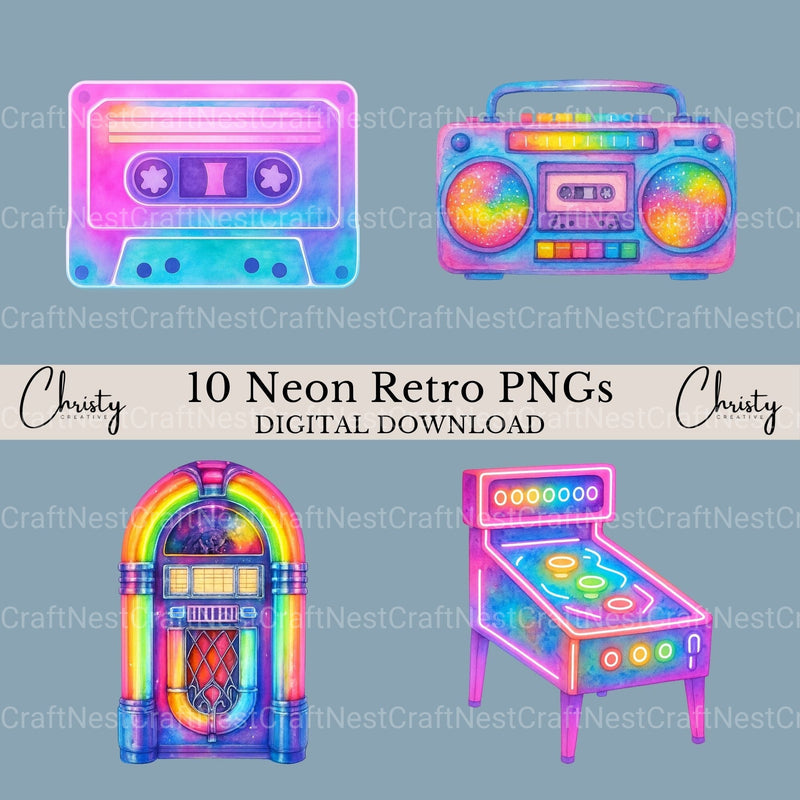 Glow with this Neon Retro 10 3 Clipart Bundle, featuring bright neon retro designs, ideal for vintage colorful crafts.