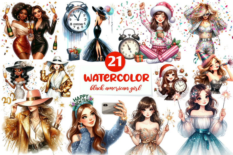 Celebrate with this New Year Black American Girl Clipart Bundle, featuring diverse celebration designs, ideal for inclusive New Year crafts.