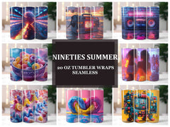 Relive the vibrant spirit of the 90s with the Nineties Summer tumbler wrap, showcasing retro patterns and bold, nostalgic colors. Perfect for 90s enthusiasts, it adds a touch of vintage charm to your drinkware. Enjoy a blast from the past with this fun and colorful wrap.