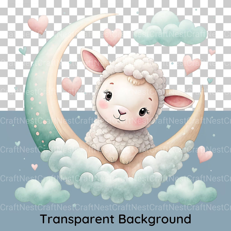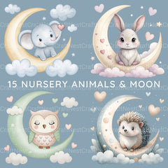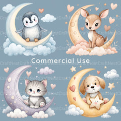 Dream with this Nursery Animals Crescent Moon 15 Clipart Bundle, featuring moon nursery animal designs, perfect for baby space crafts.