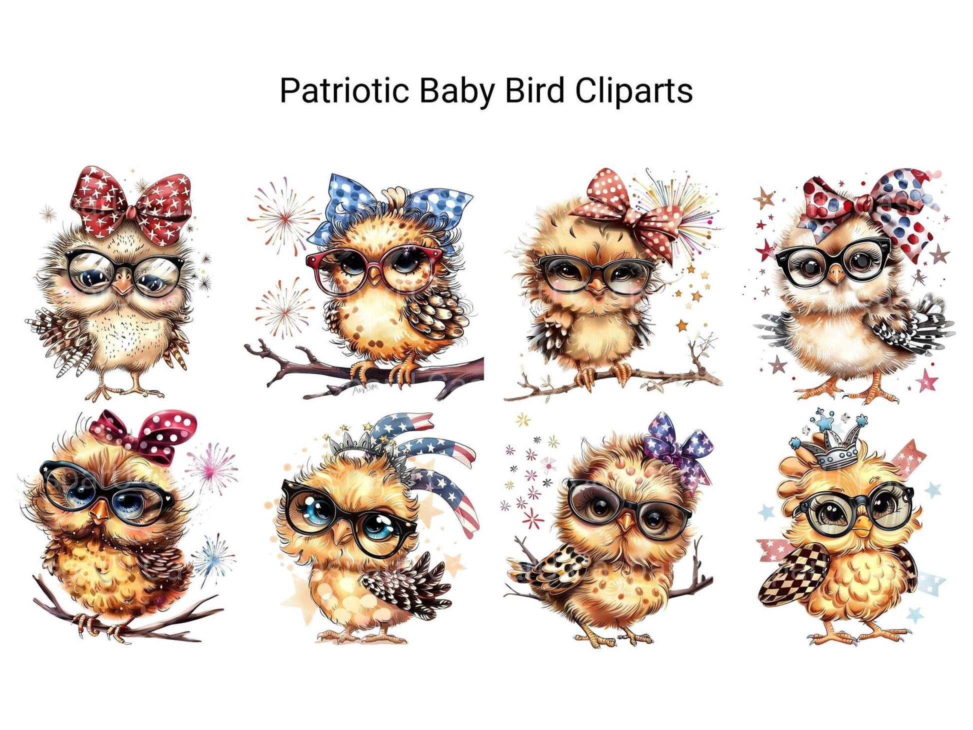 Salute the day with this Patriotic Baby Bird Clipart bundle, featuring cute patriotic birds, ideal for 4th of July projects.